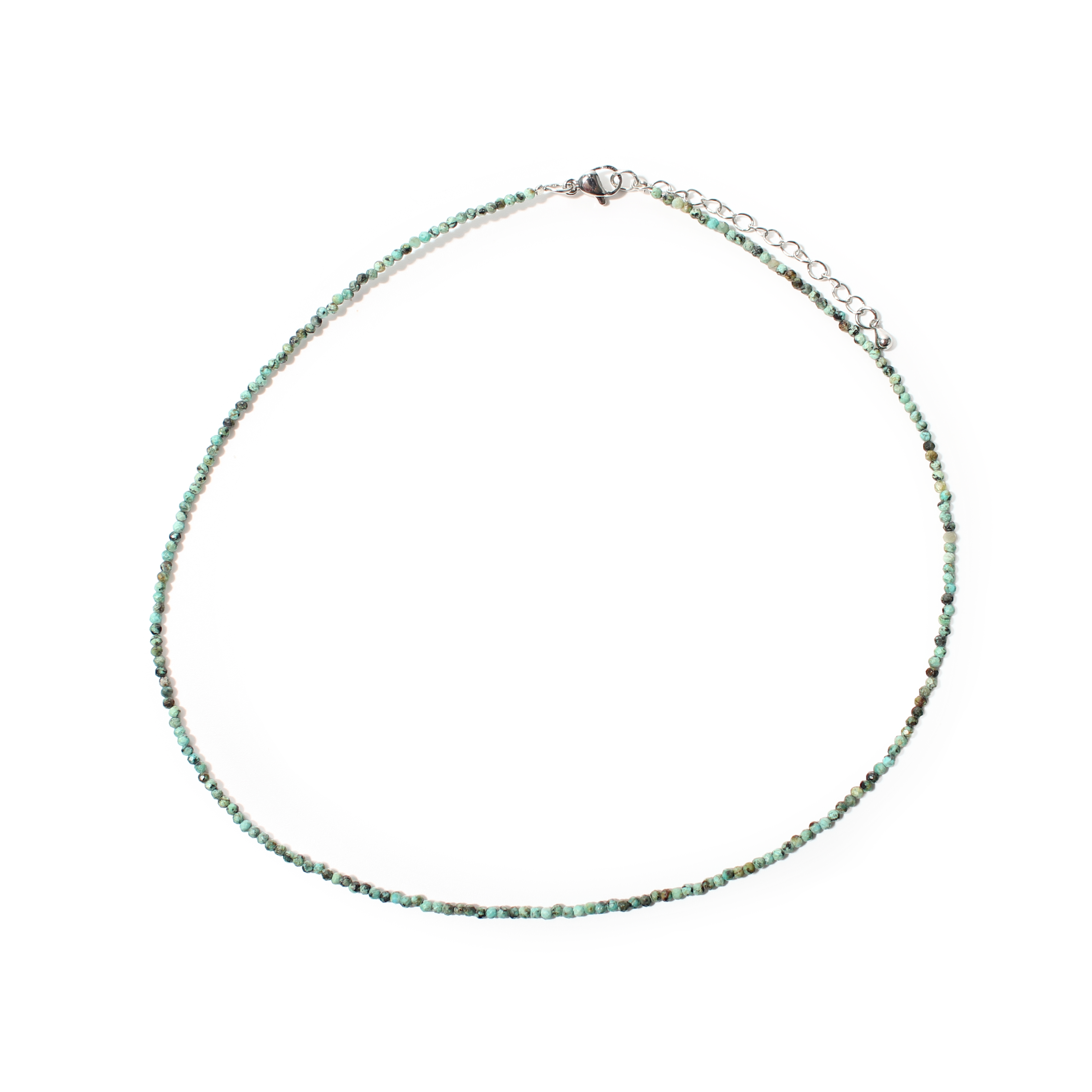 This African Turquoise Bead Necklace features dainty 2–3mm beads in earthy teal and green tones with natural matrix patterns, creating a grounding yet vibrant style for everyday wear or layering.