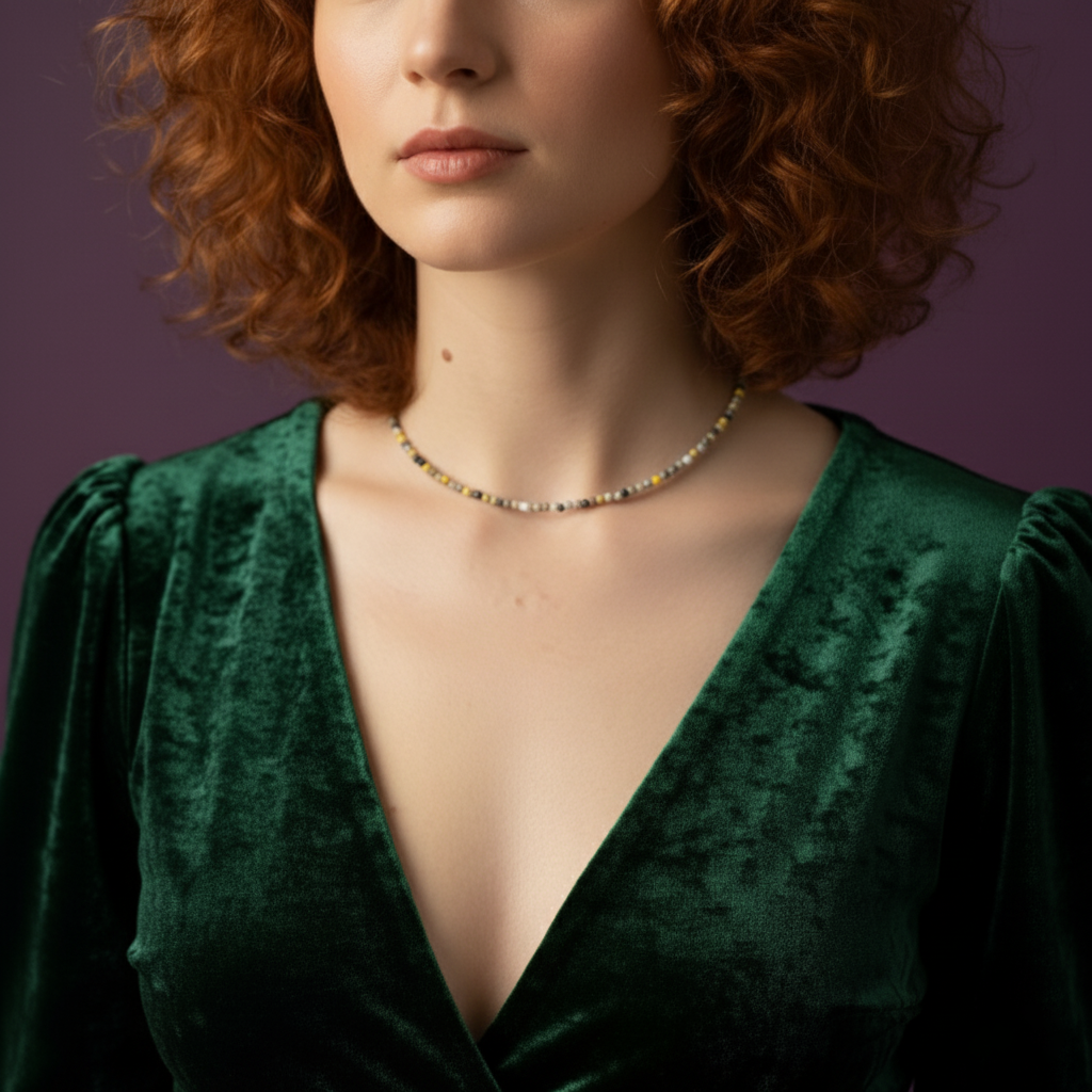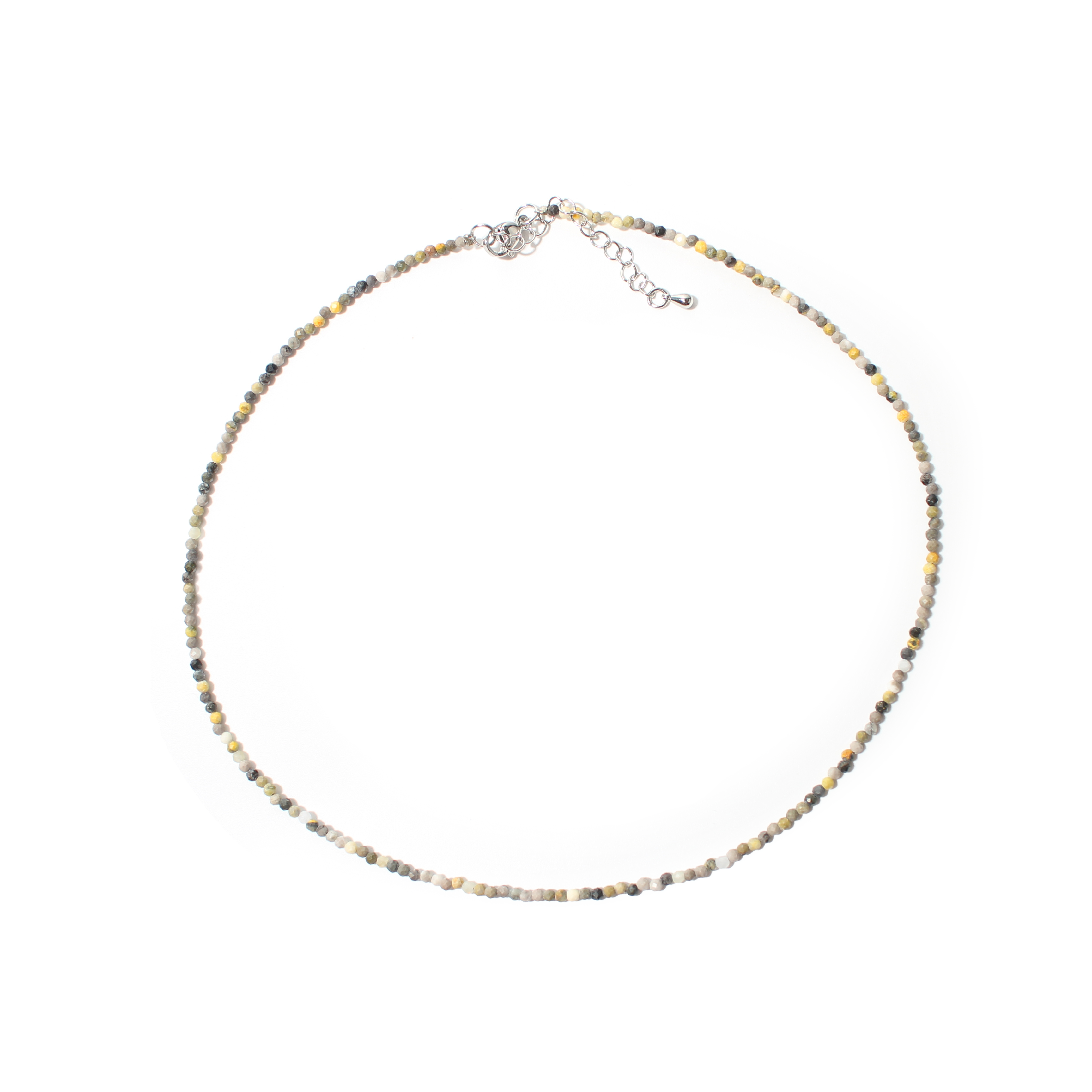 This Bumble Bee Jasper Bead Necklace features delicate 2–3mm beads in striking bands of yellow, orange, and grey, adding a bold yet earthy accent perfect for daily wear or layering.