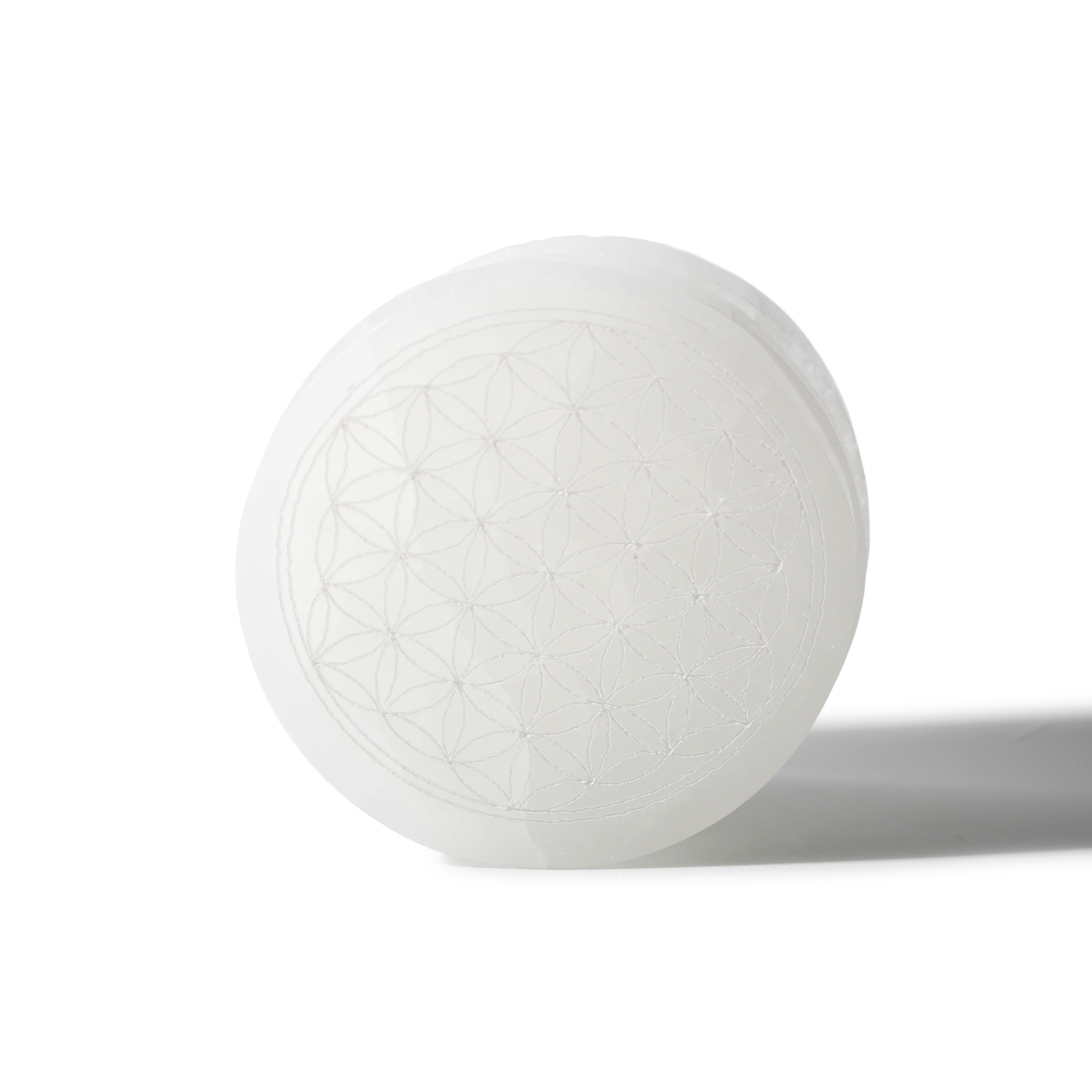 Hand-polished circular Selenite charging plates with a transparent pearly-white sheen and a Flower graphic.