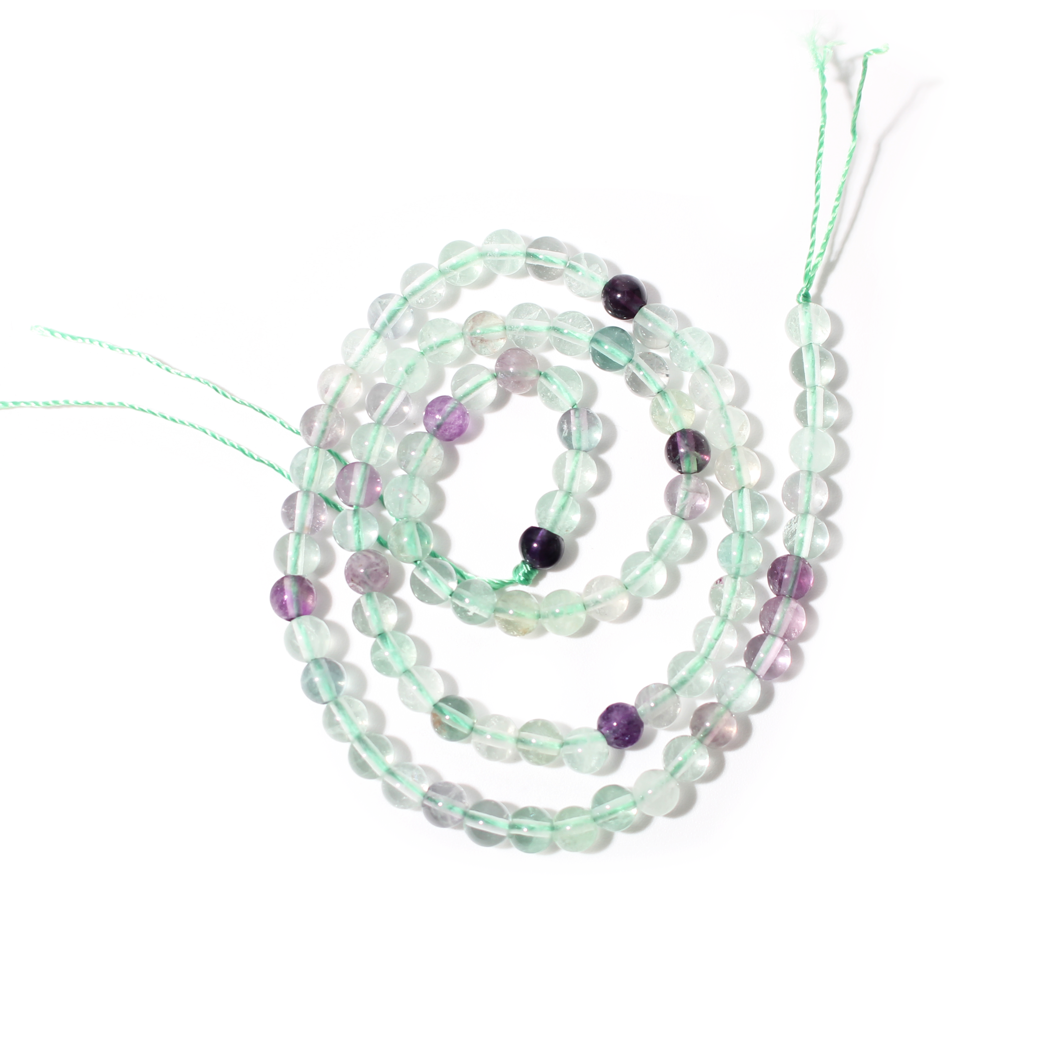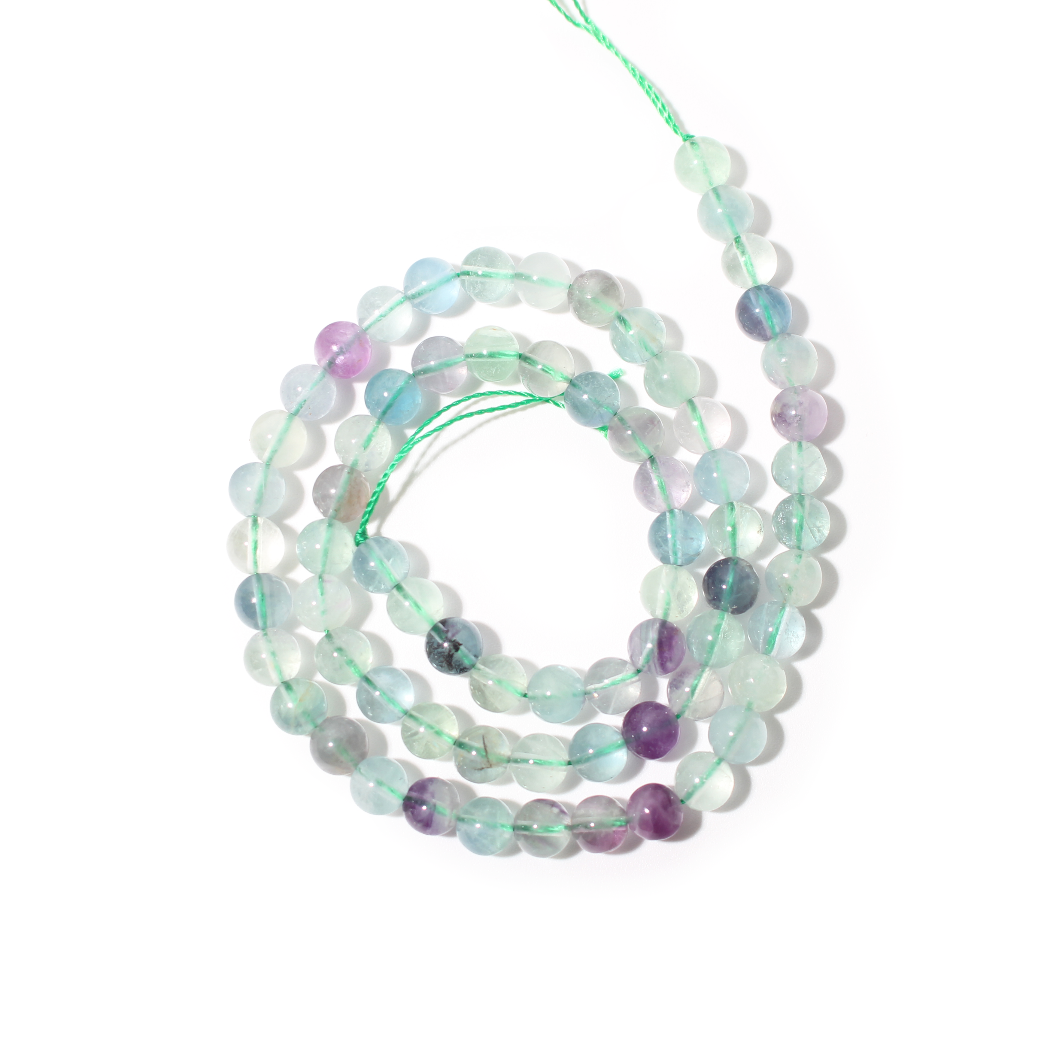 This Fluorite Round Strand displays a beautiful mix of purple, green, blue, and clear hues. The natural banding and vibrant tones make each strand visually unique.