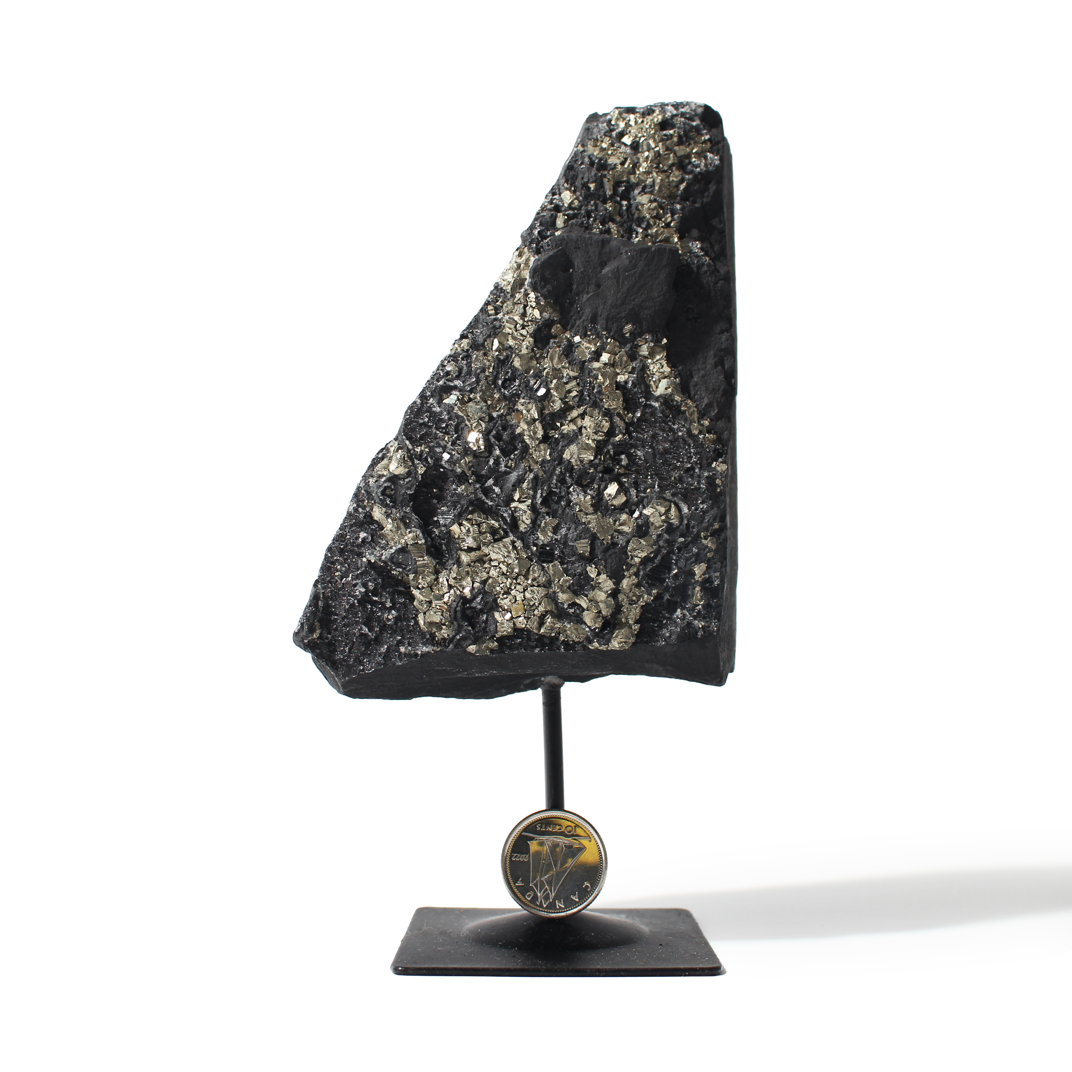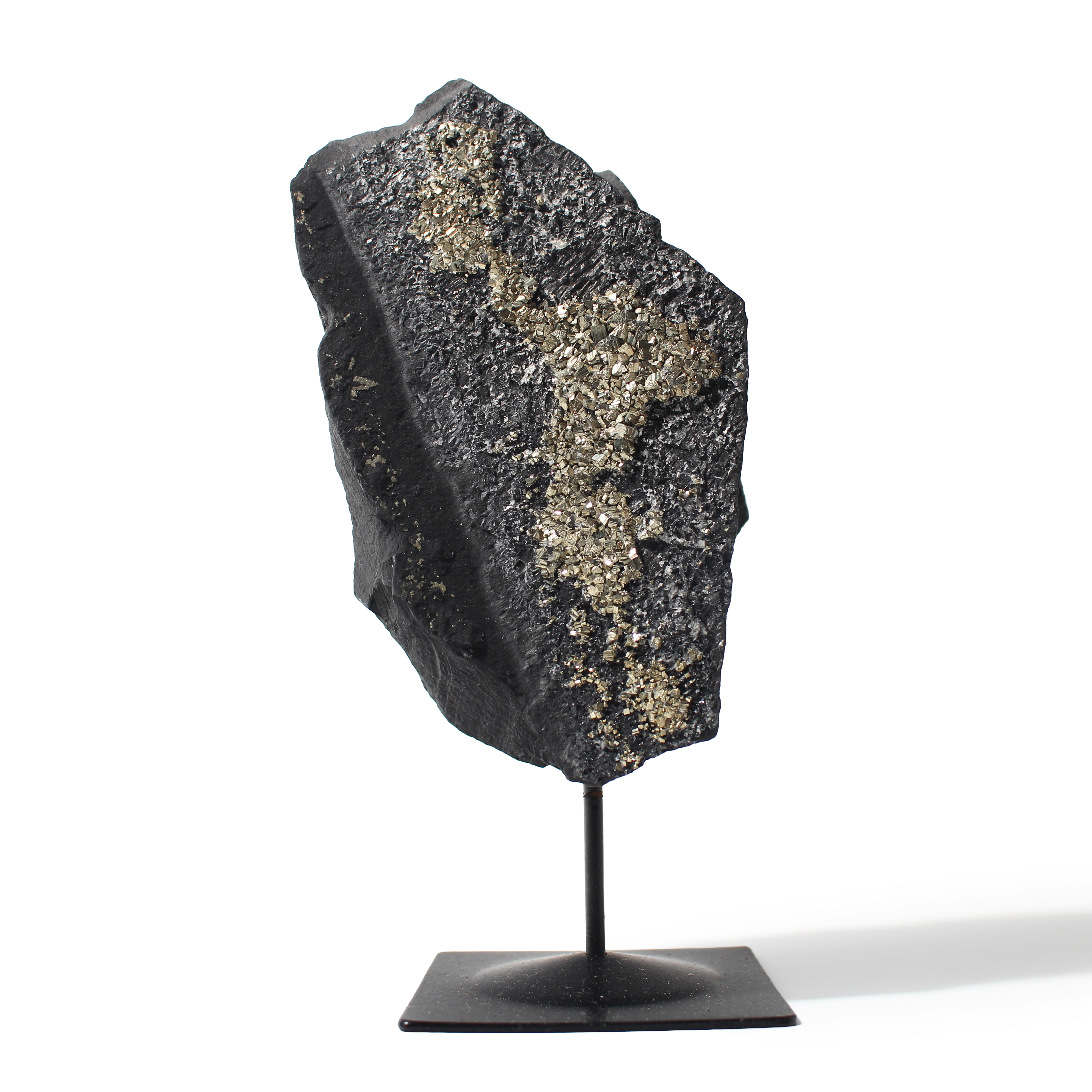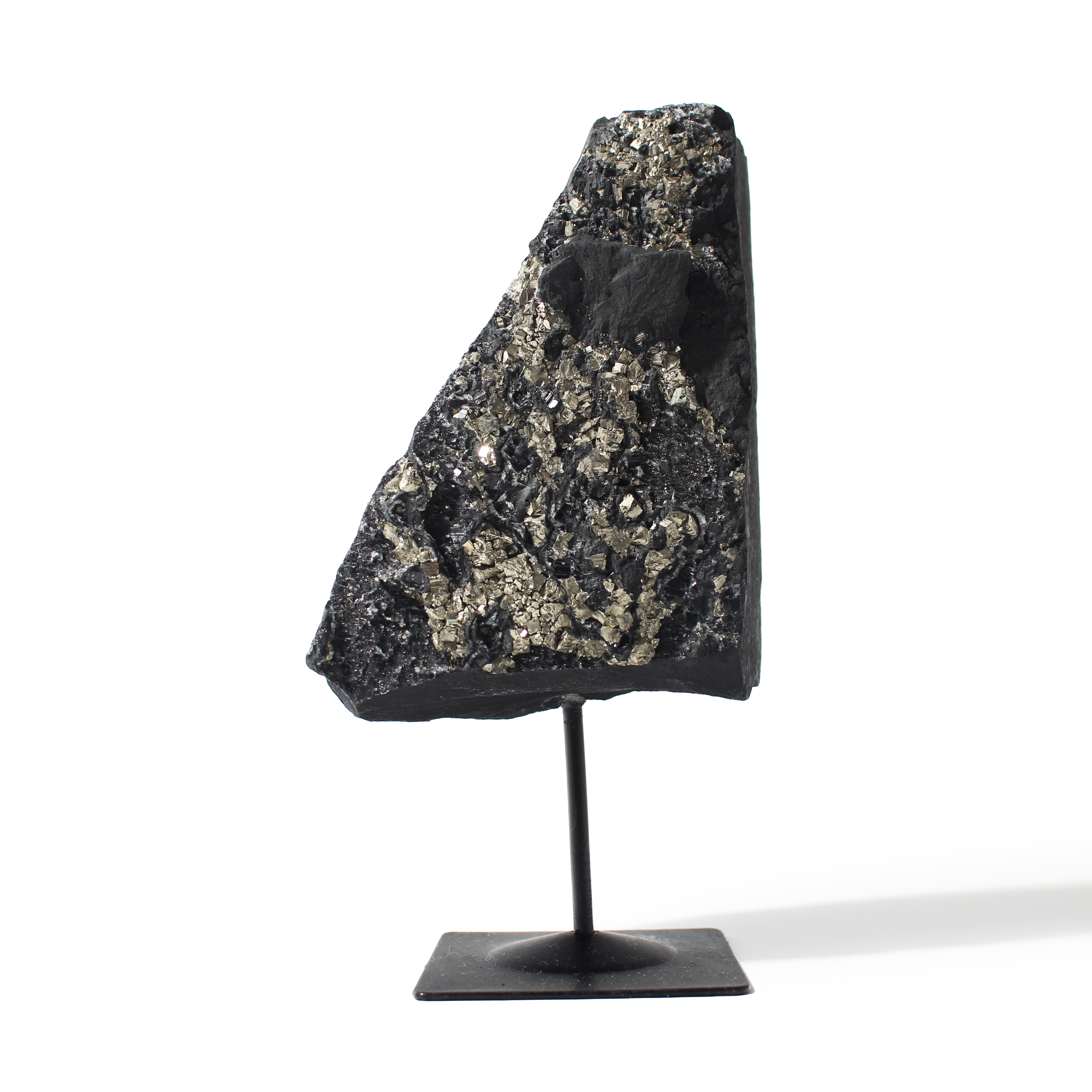 Pyrite on Basalt Specimen #5 features dazzling golden pyrite crystals naturally embedded in dark, volcanic basalt. This striking contrast of sparkle and stone makes it a standout for collectors and grounding energy work.