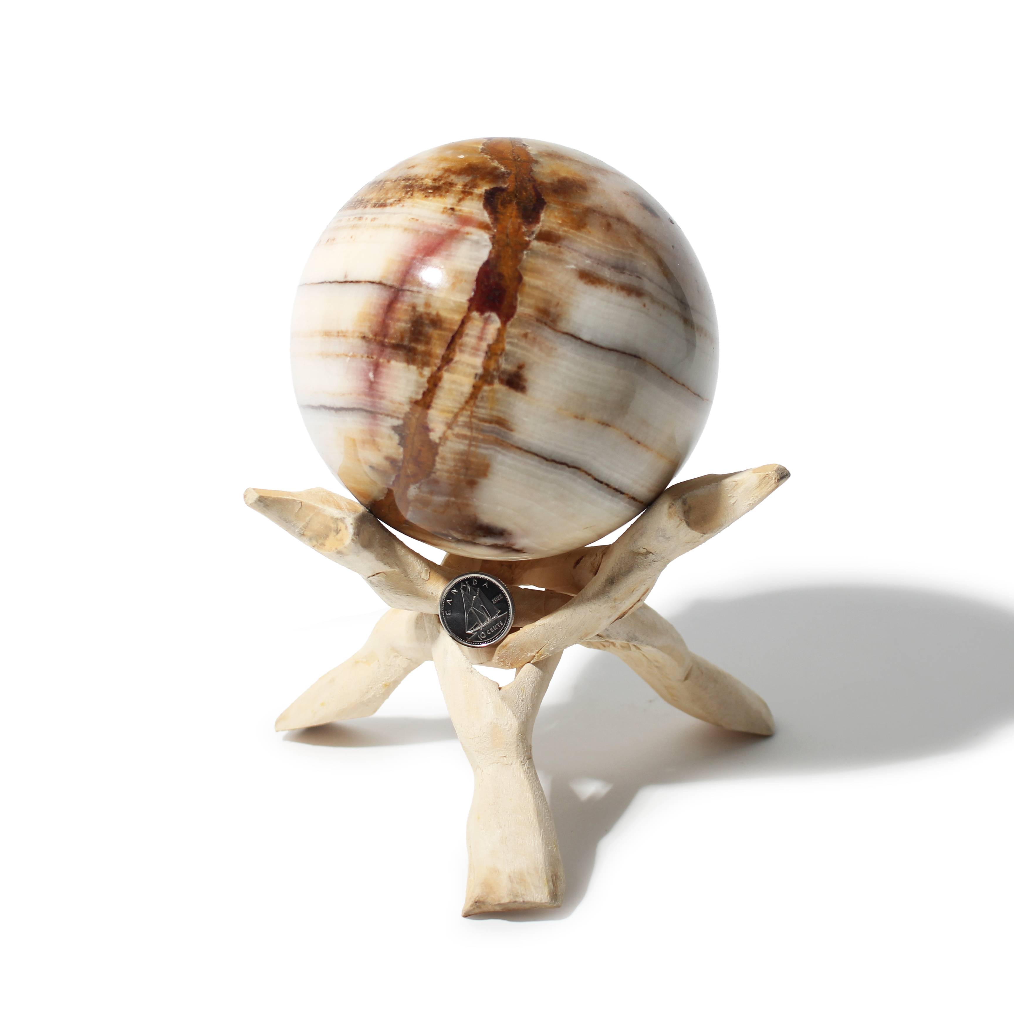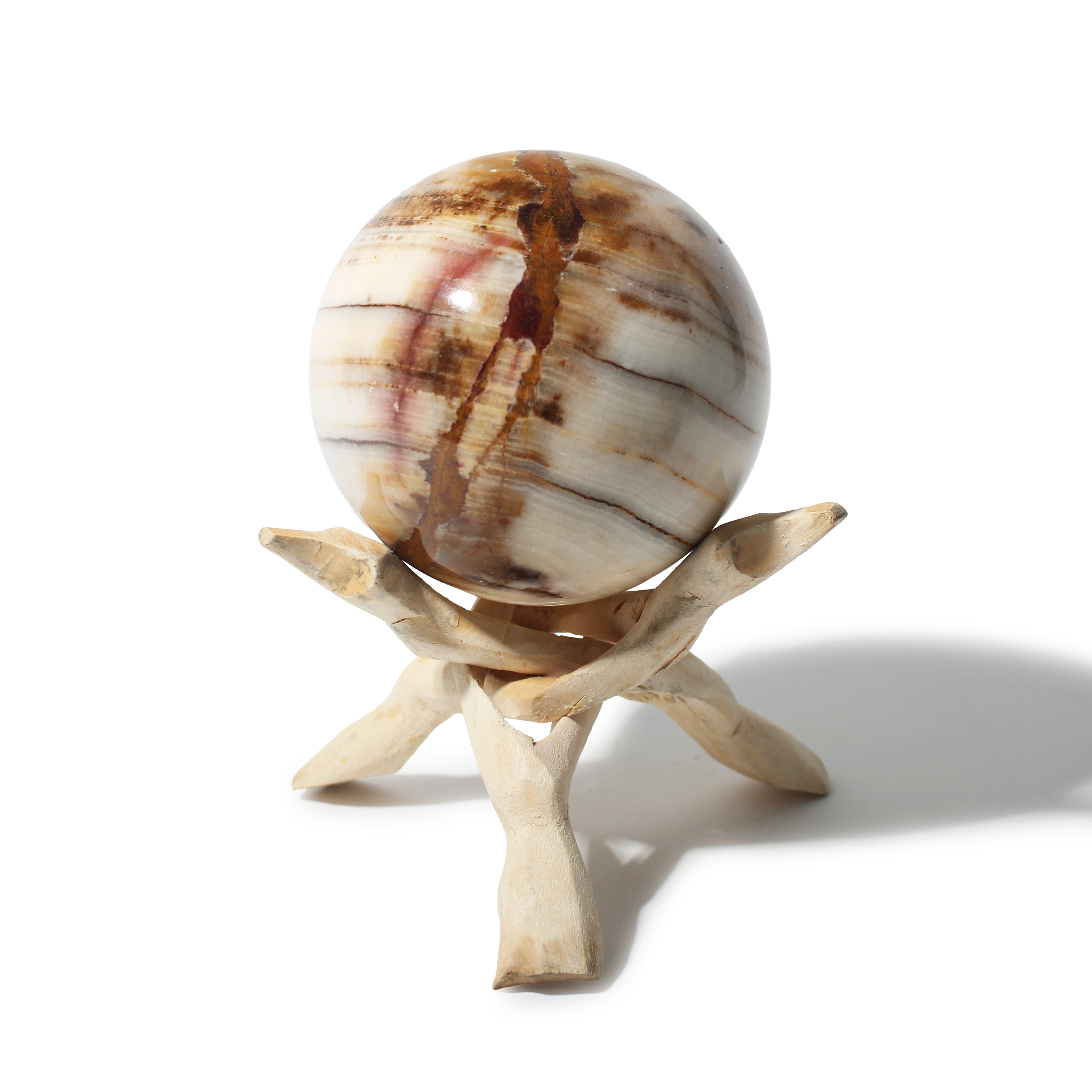 This Banded Aragonite Sphere features warm earth-toned bands in shades of tan, cream, and soft brown, polished into a smooth spherical shape that feels grounding and steady.
