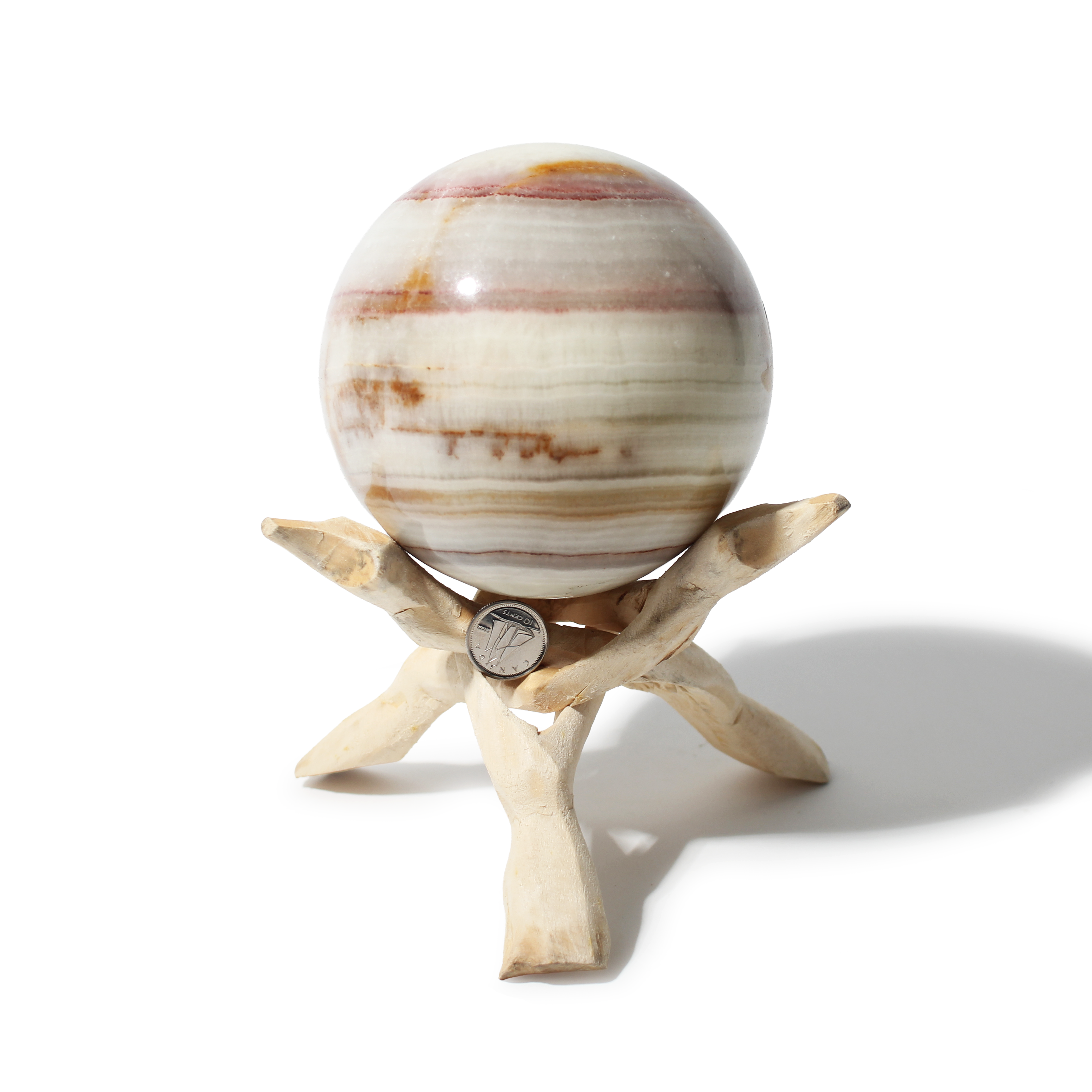 This Banded Aragonite Sphere features layered bands in warm tones of cream, tan, and soft brown, polished into a smooth spherical form that brings a grounding, balanced presence.