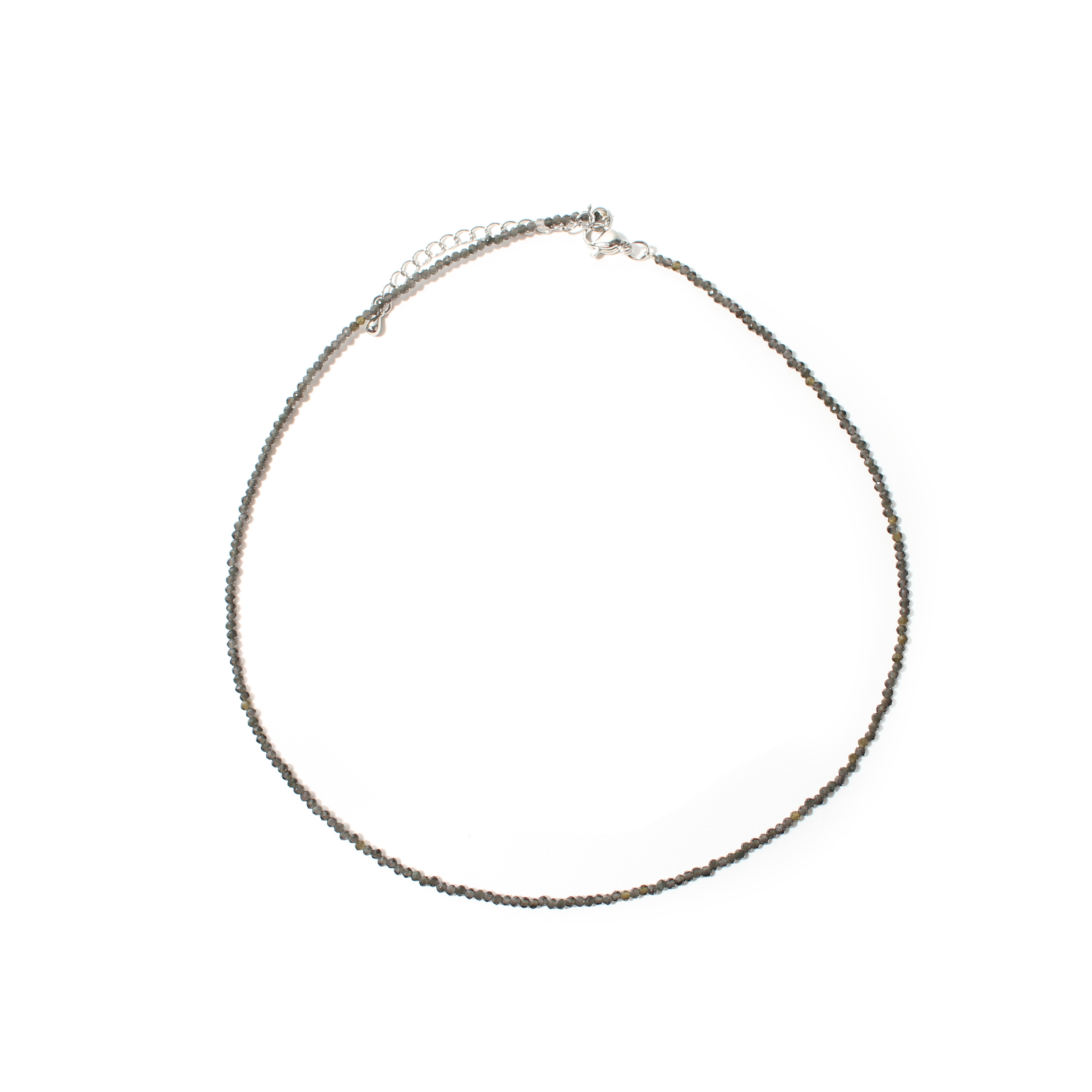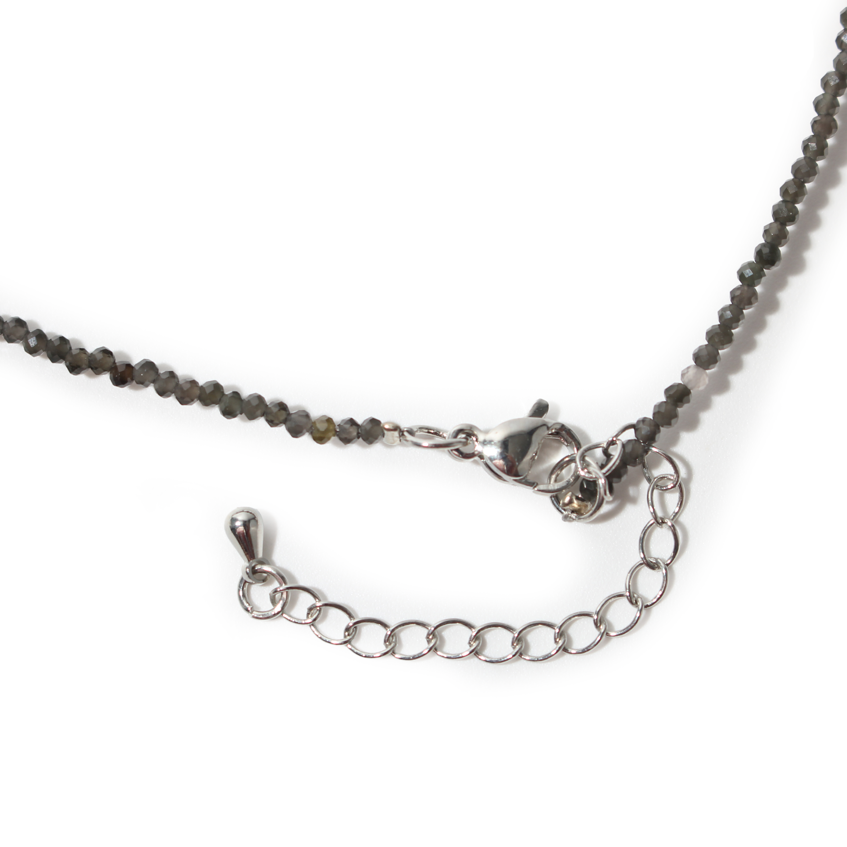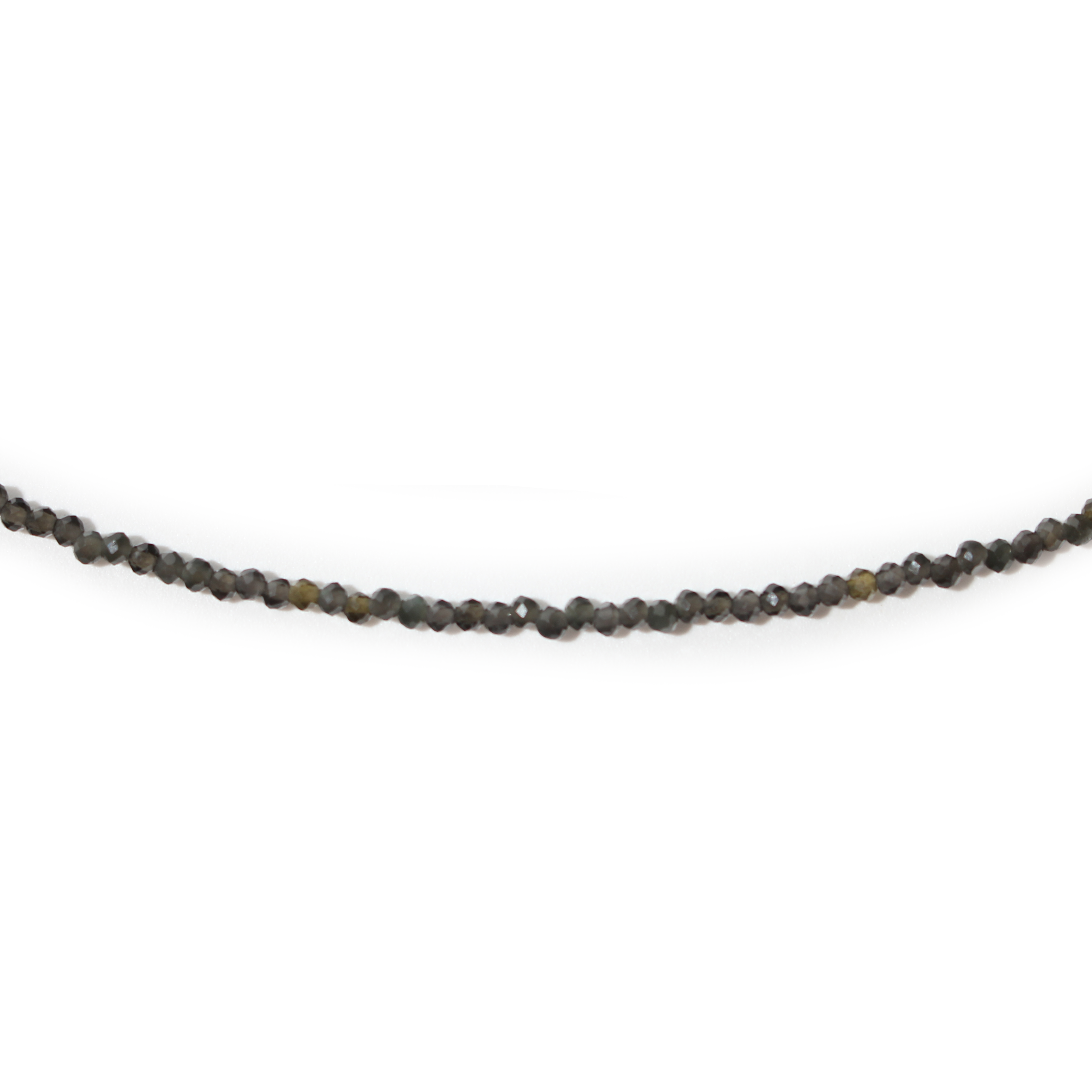 This Black Obsidian Bead Necklace features dainty 2–3mm beads in a sleek, glossy black finish, offering a bold, grounding look perfect for layering or daily wear.