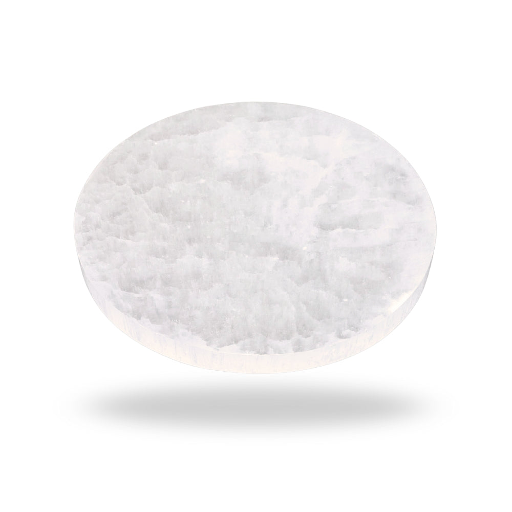This Large Selenite Charging Plate features a luminous white surface with a satin-like glow, perfect for cleansing and recharging your crystals, jewelry, or sacred tools.