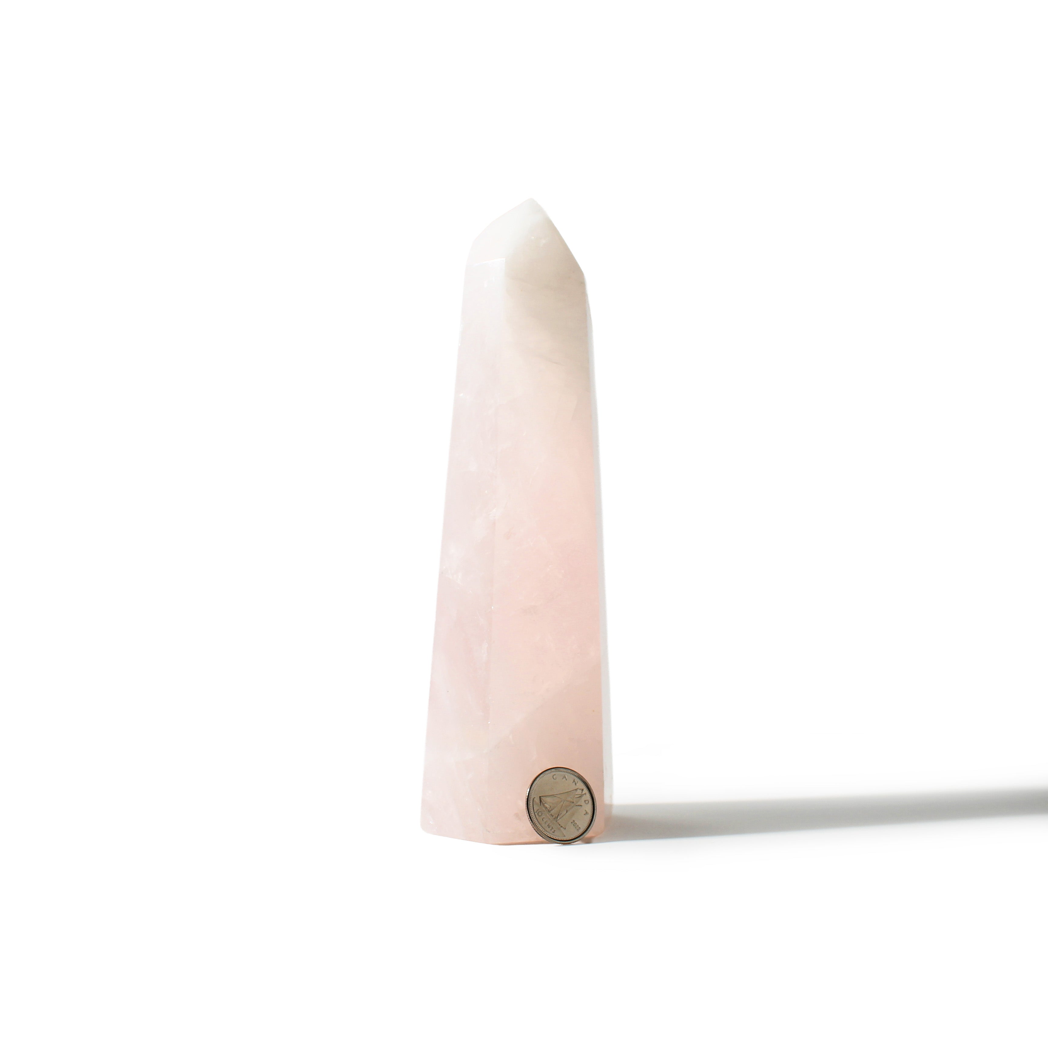This Rose Quartz Generator stands 6 1/2" tall, showcasing soft blush-pink tones with gentle translucency, polished into a smooth, elegant point that radiates calming, heart-centered energy. Each piece highlights Rose Quartz's natural beauty and soothing presence.