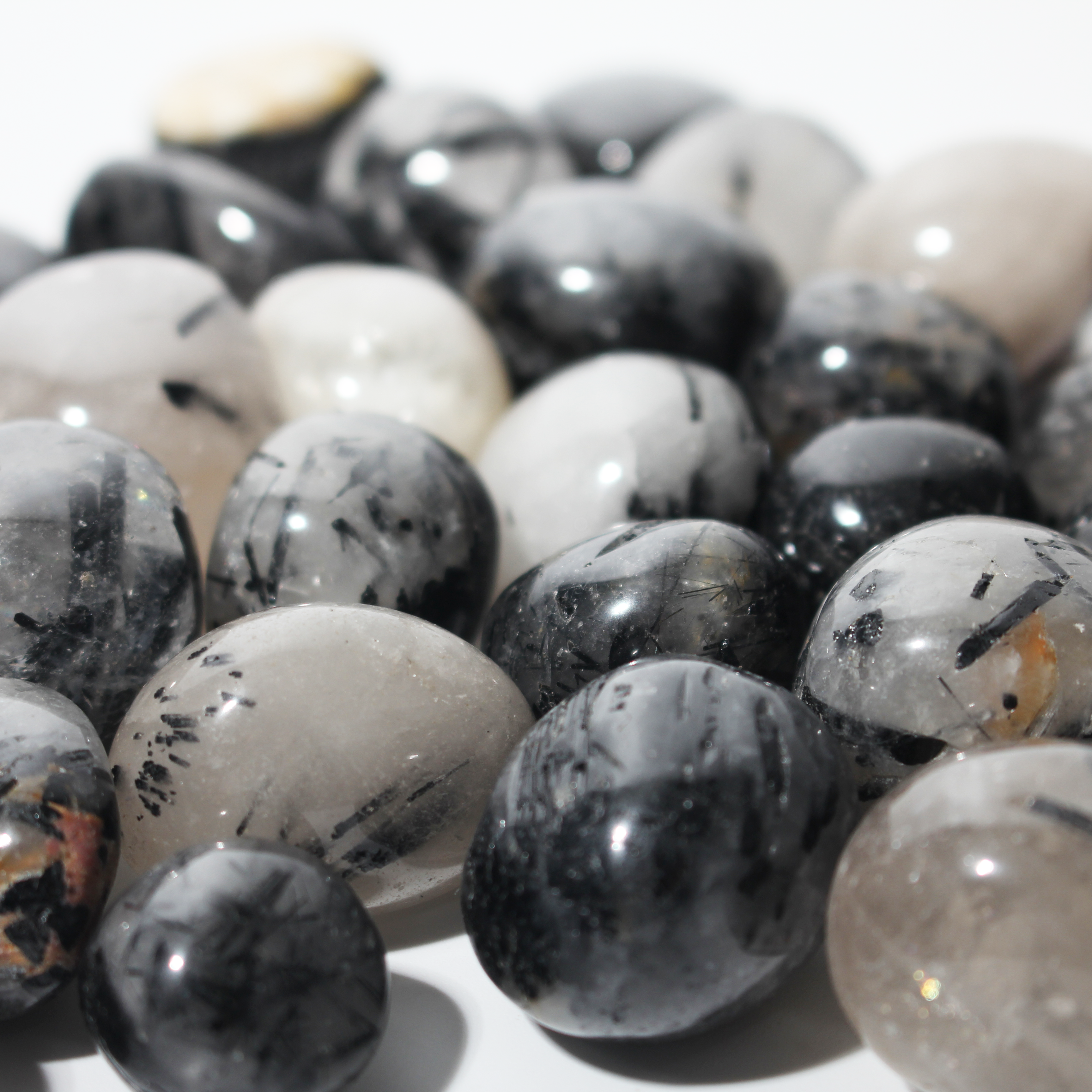 These Tourmalinated Quartz Tumbled Stones feature clear to milky Quartz threaded with fine black Tourmaline inclusions, polished smooth for a dynamic, grounding feel. Each piece blends clarity with protection.