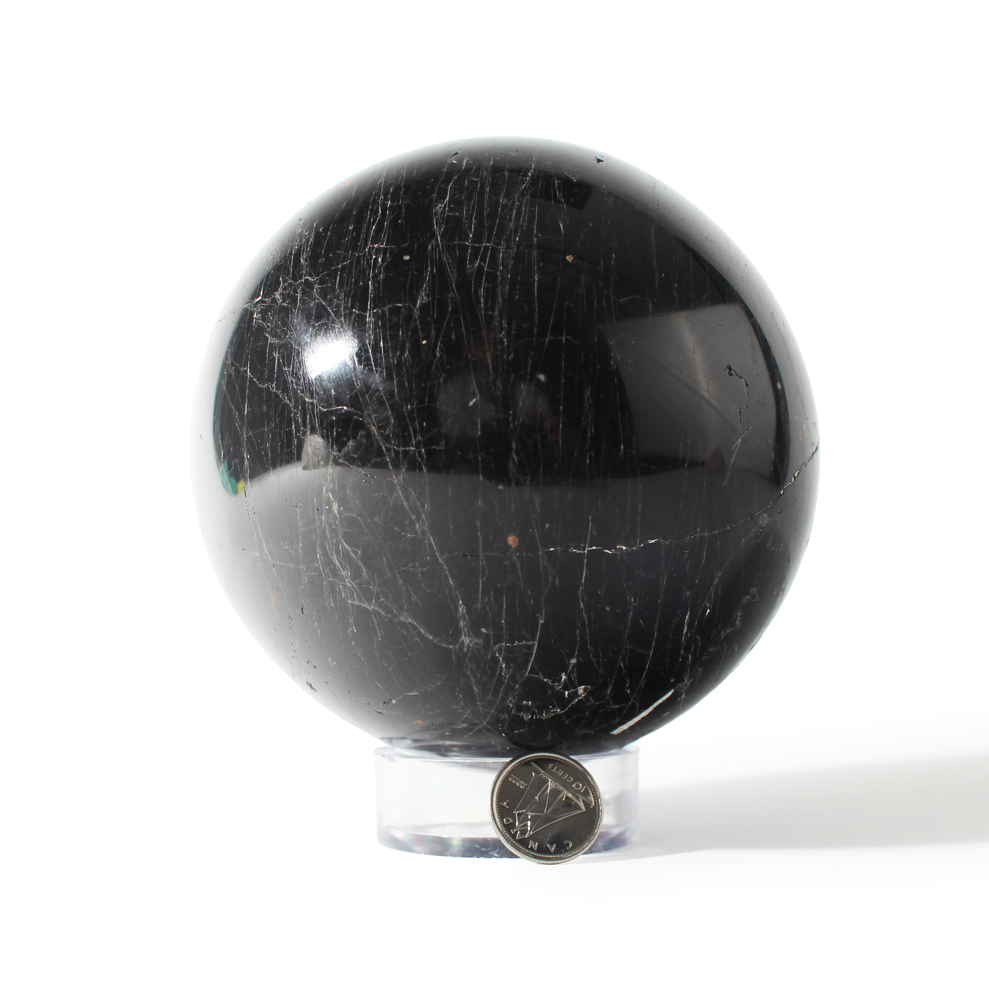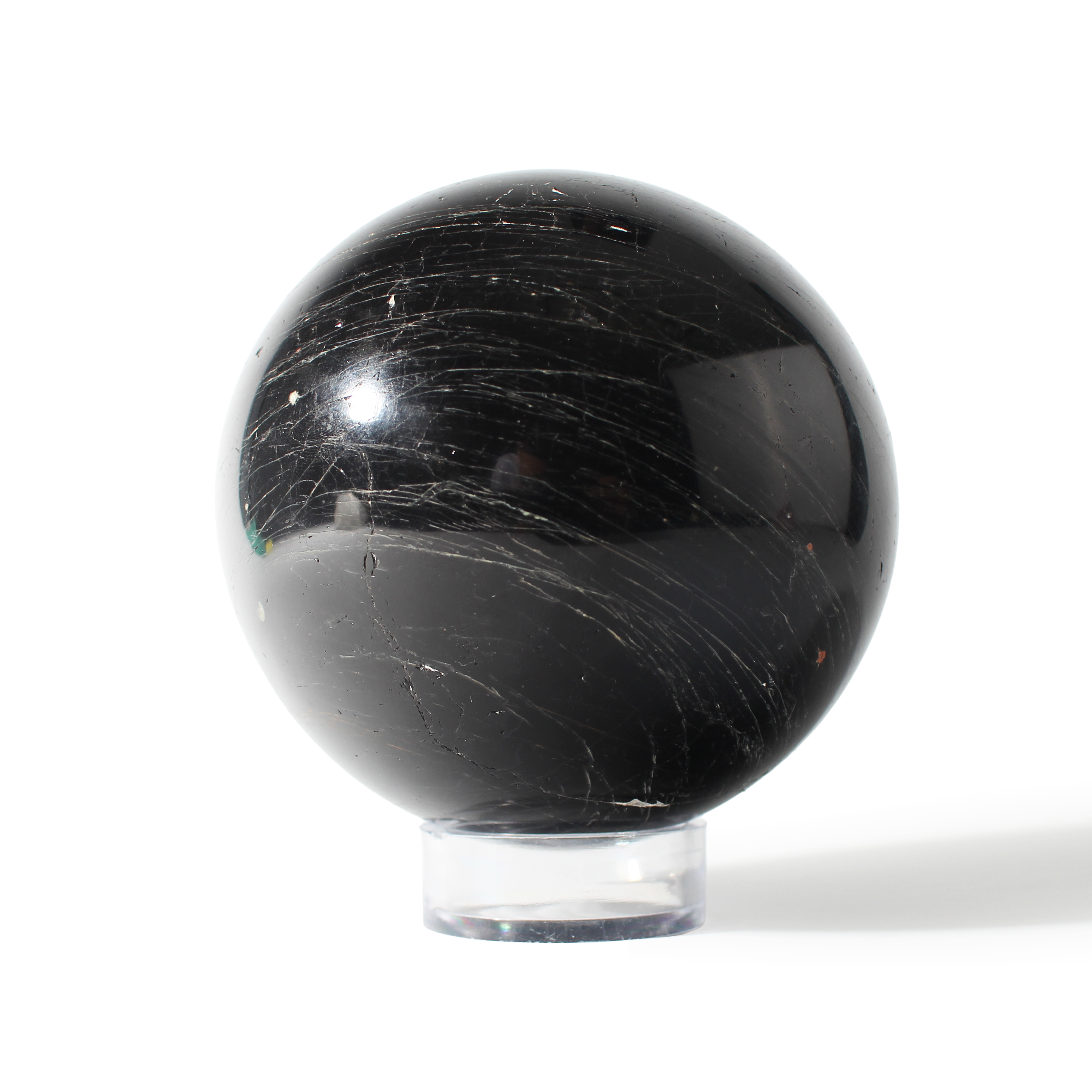 Tourmaline with Hematite Sphere Unique #5 measures 4 1/4" and features a striking mix of black tourmaline streaks and metallic hematite shimmer. Protective and grounding, it’s a powerful ally for energetic stability and focus.
