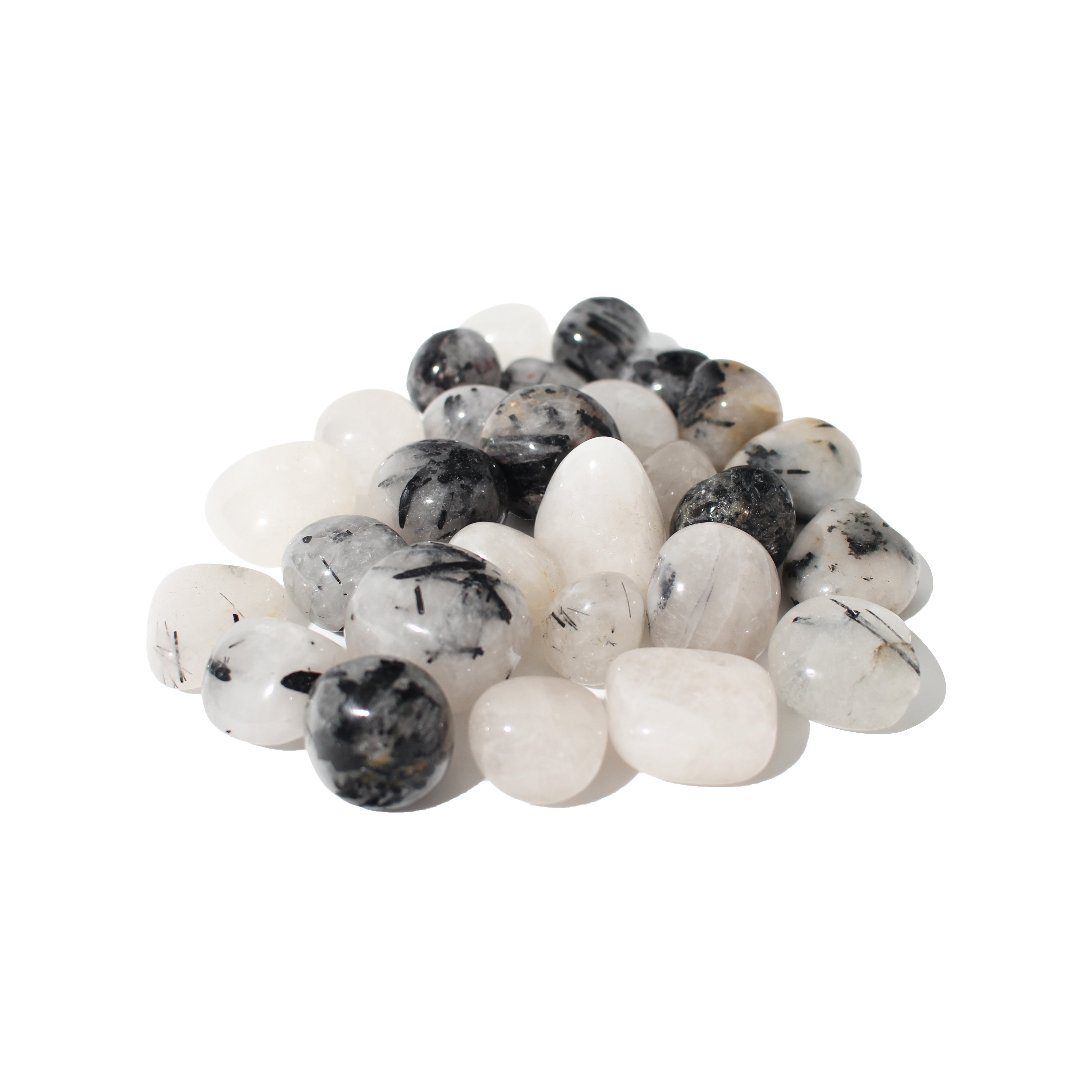These Tourmalinated Quartz Tumbled Stones feature clear to milky Quartz threaded with fine black Tourmaline inclusions, polished smooth for a dynamic, grounding feel. Each piece blends clarity with protection.