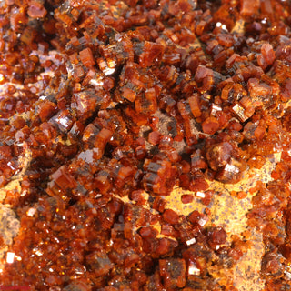 Vanadinite is a mineral from the apatite group, known for its small hexagonal crystals in various colours like bright red, orange-red, brownish-red, or yellow. These crystals often cluster together and have distinct shapes. Collectors highly value it for its vibrant colour and unique crystal forms.