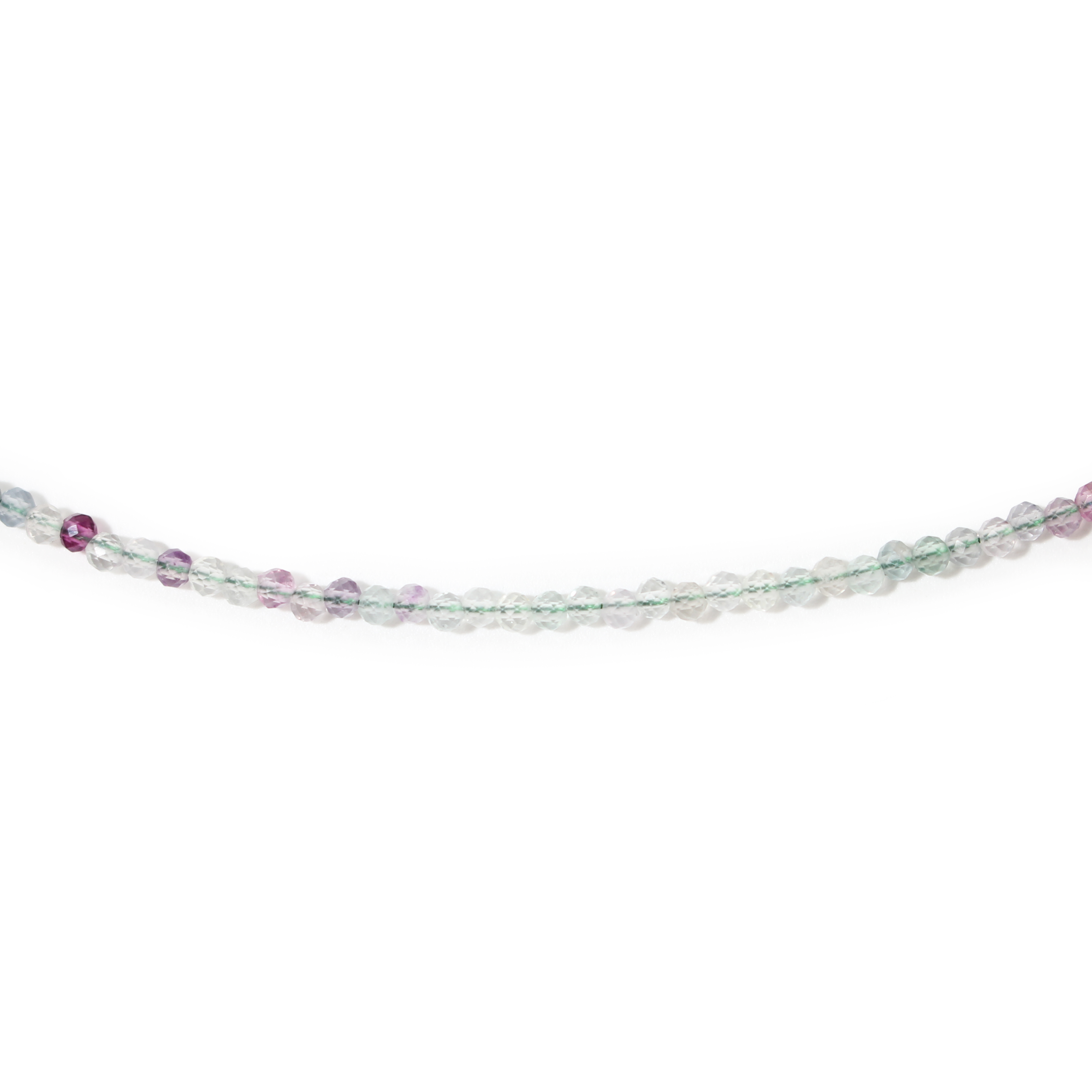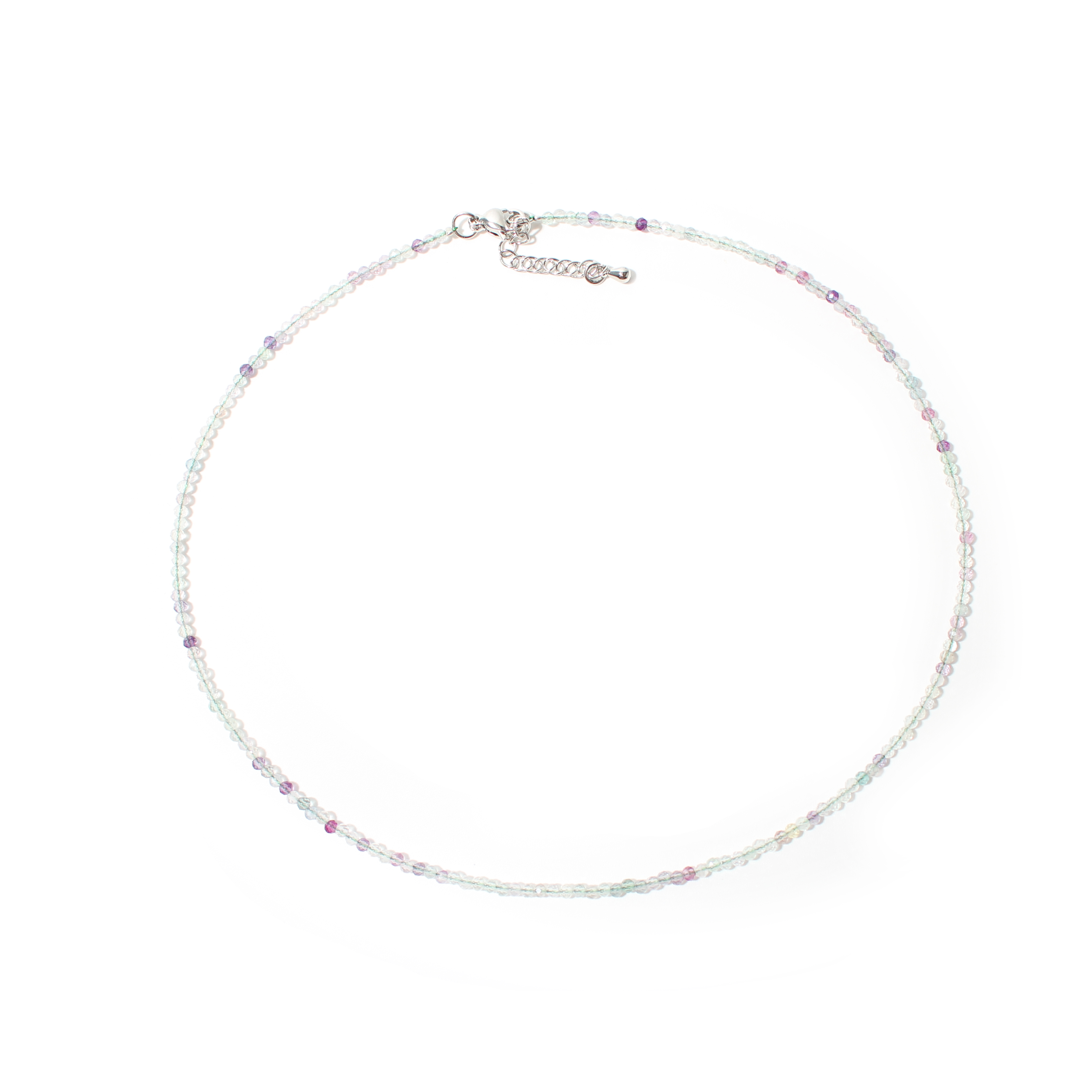 This Fluorite Bead Necklace features dainty 2–3mm beads in a mix of soft purples, greens, and clear tones, creating a subtle yet vibrant look ideal for layering or everyday wear.