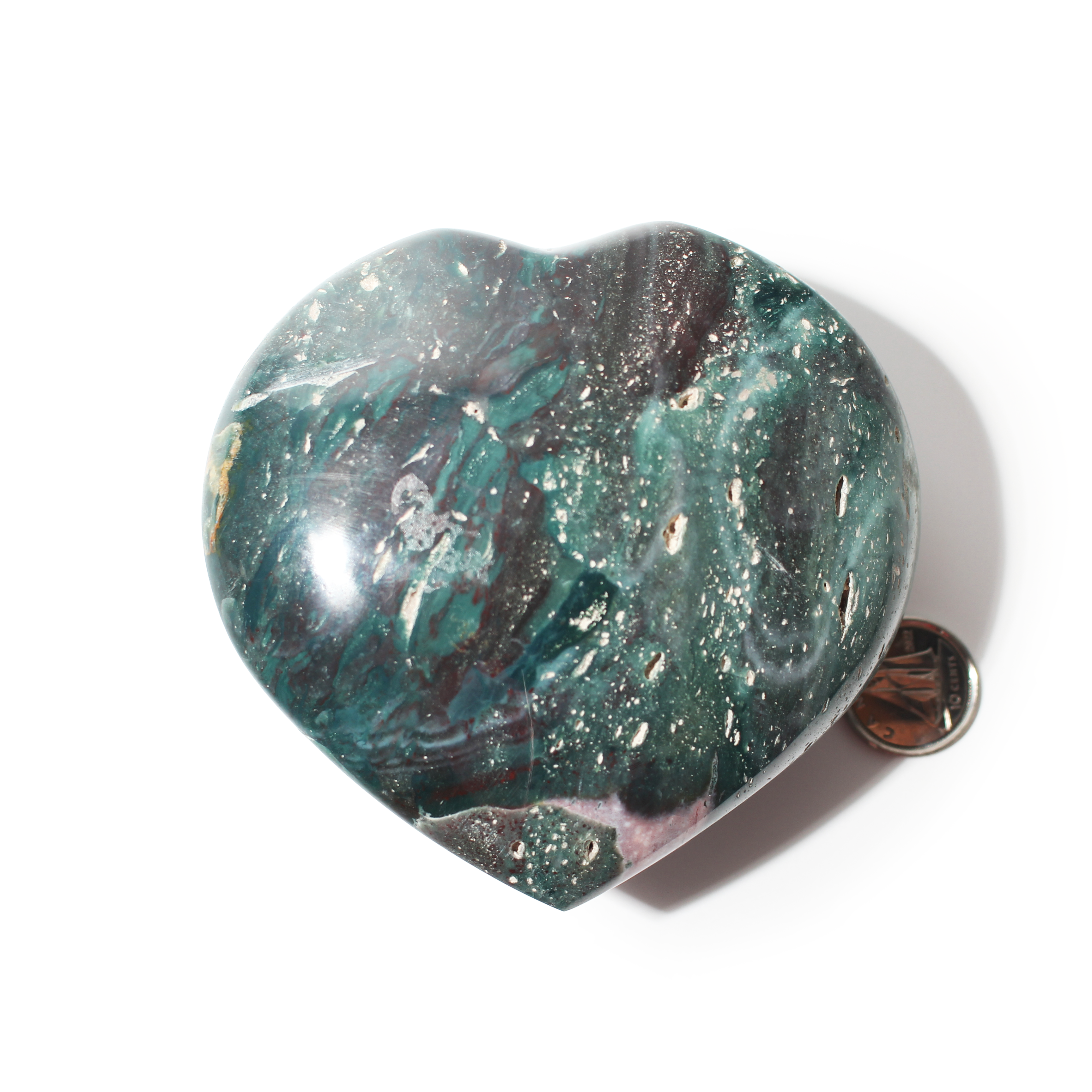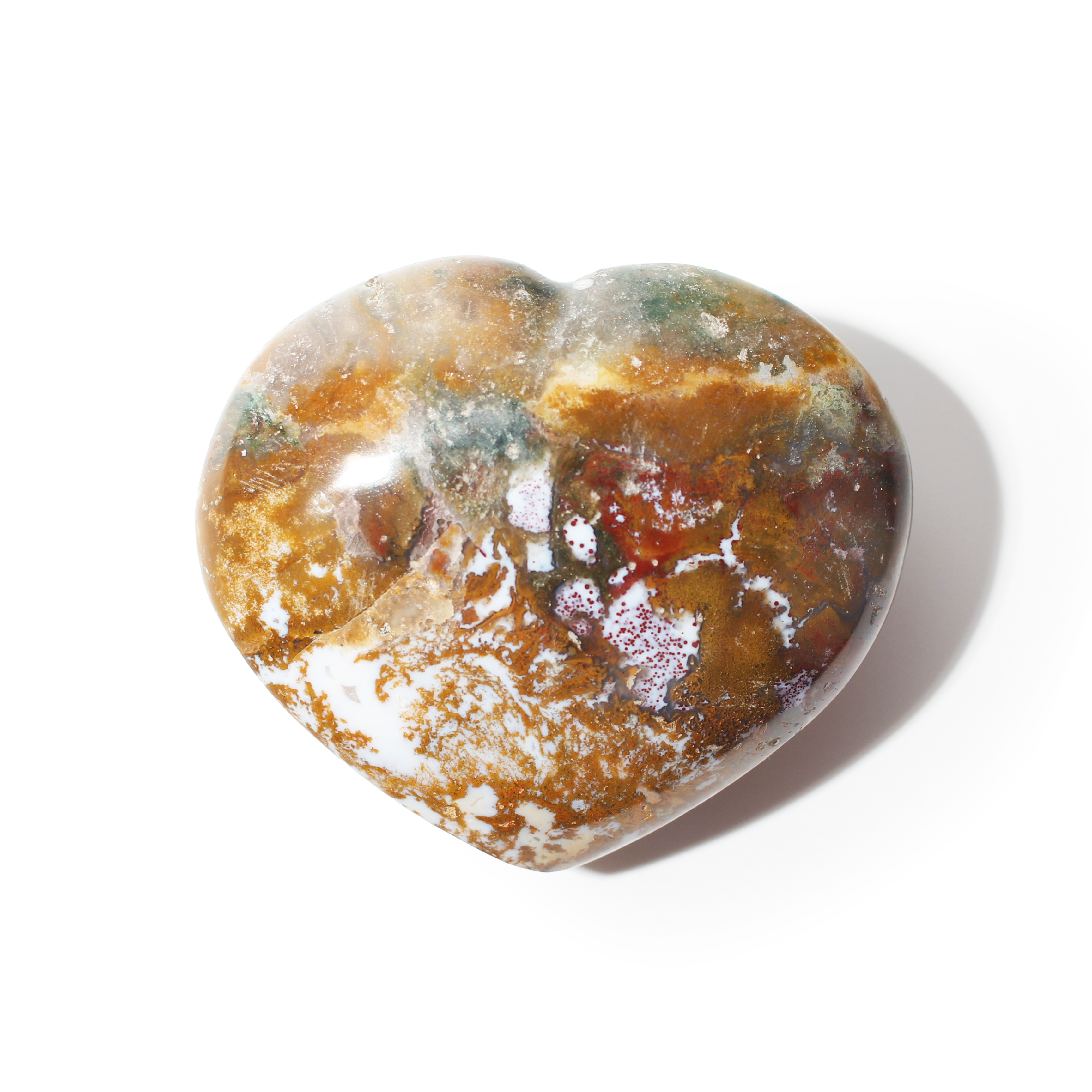 This Ocean Jasper Heart showcases swirling patterns and orb-like inclusions in earthy tones of green, cream, pink, and brown. Polished to a smooth finish, it carries nurturing, joyful energy with a deep connection to nature and flow.