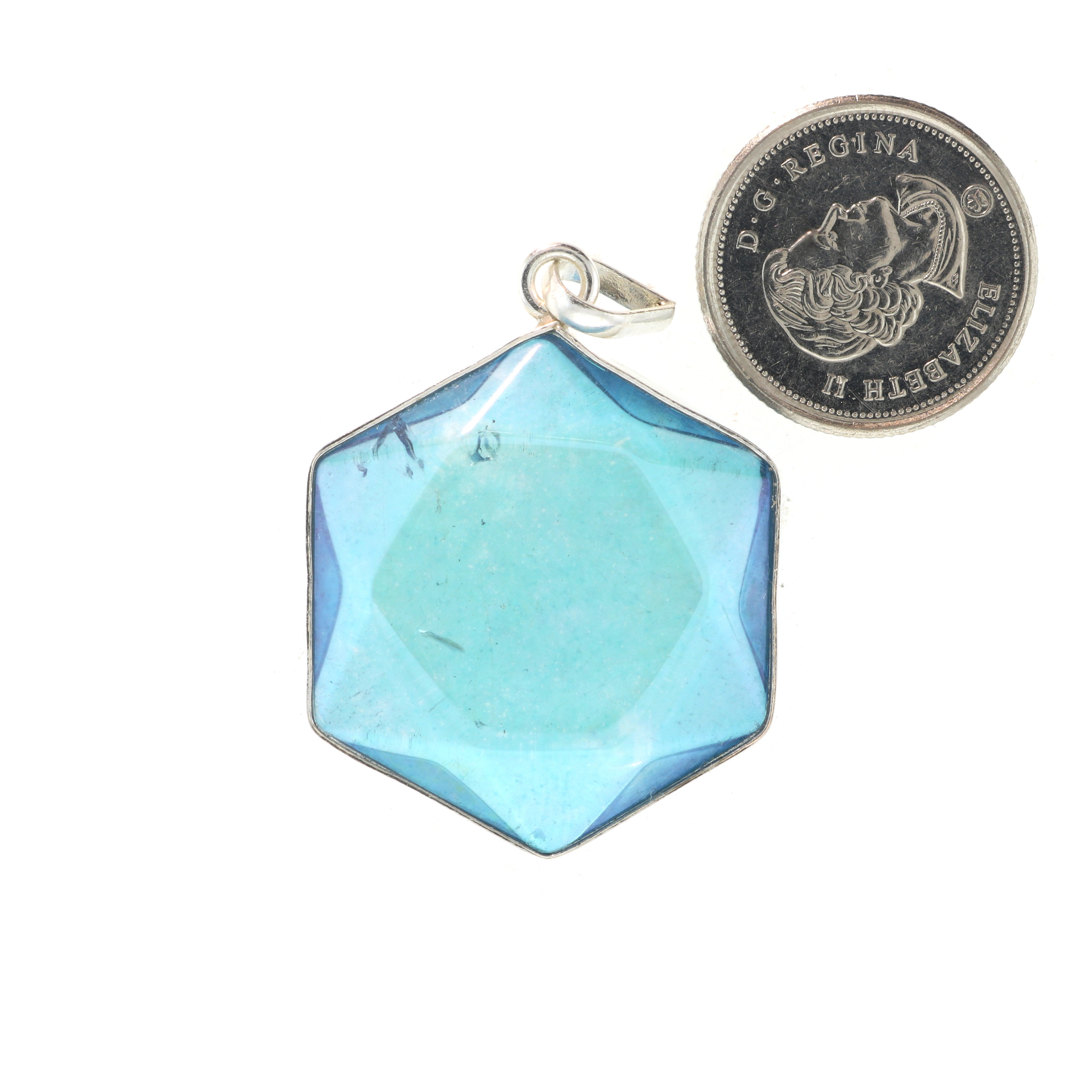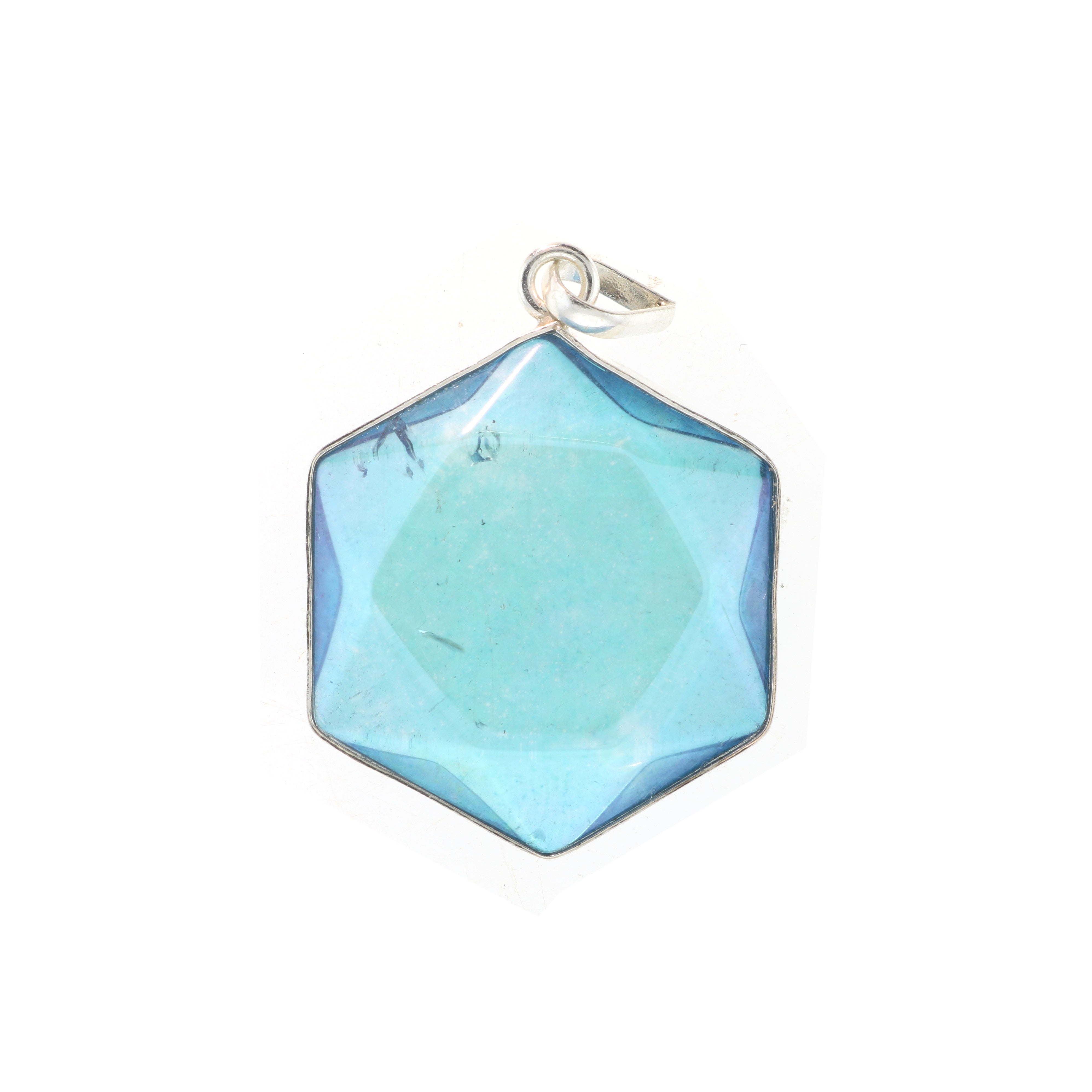 Cœur Aqua Aura taillé et poli, d'une belle couleur bleu vif avec des éclats violets chatoyants et une opalescence renforcée tout en produisant un cristal bleu électrique ou bleu ciel avec un éclat étincelant et un léger arc-en-ciel irisé ; nommé d'après sa riche couleur aigue-marine. Suspendu à une chaîne et un anneau en métal plaqué argent.