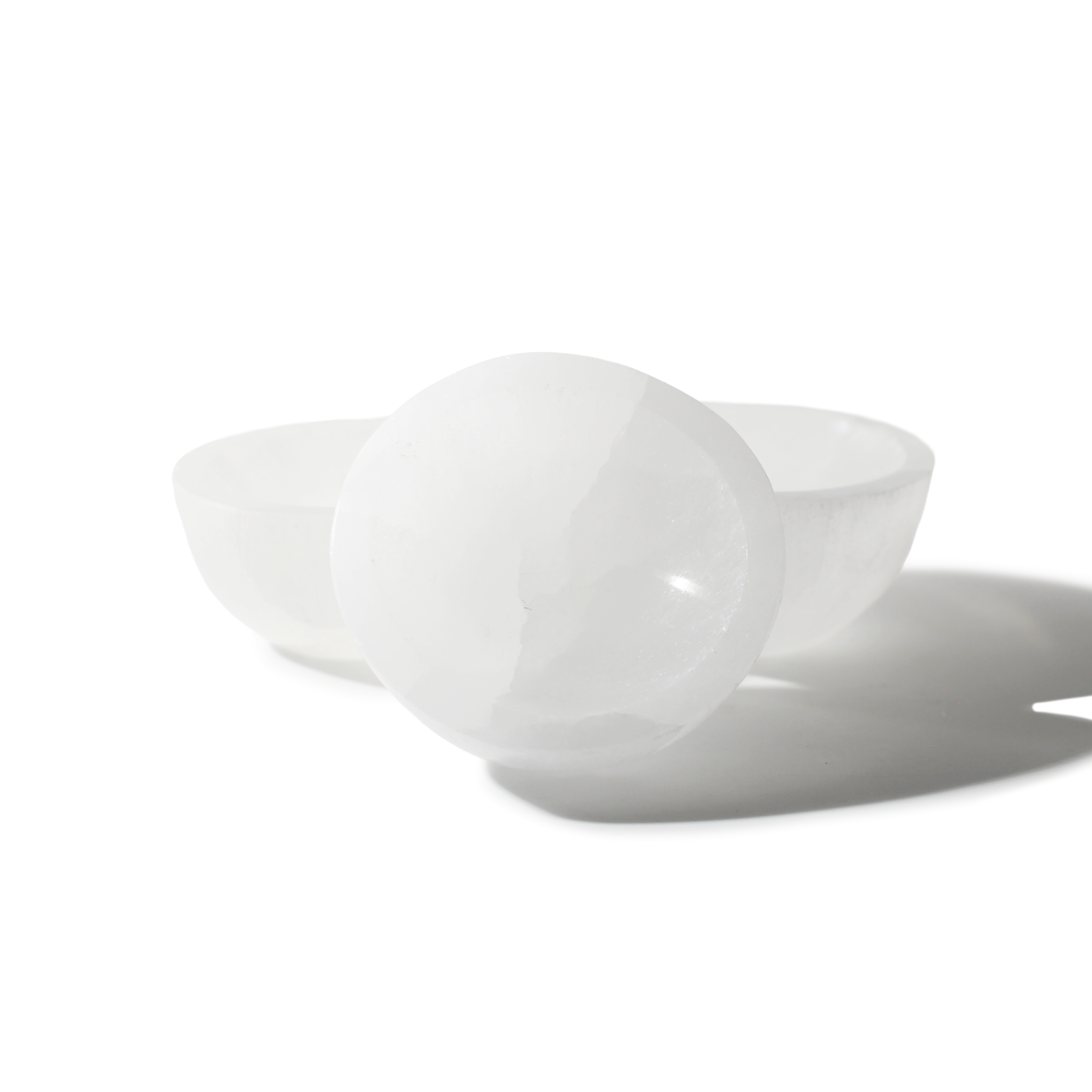 Hand-carved round Selenite bowls with a translucent sheen to pearly-white milky tones.
