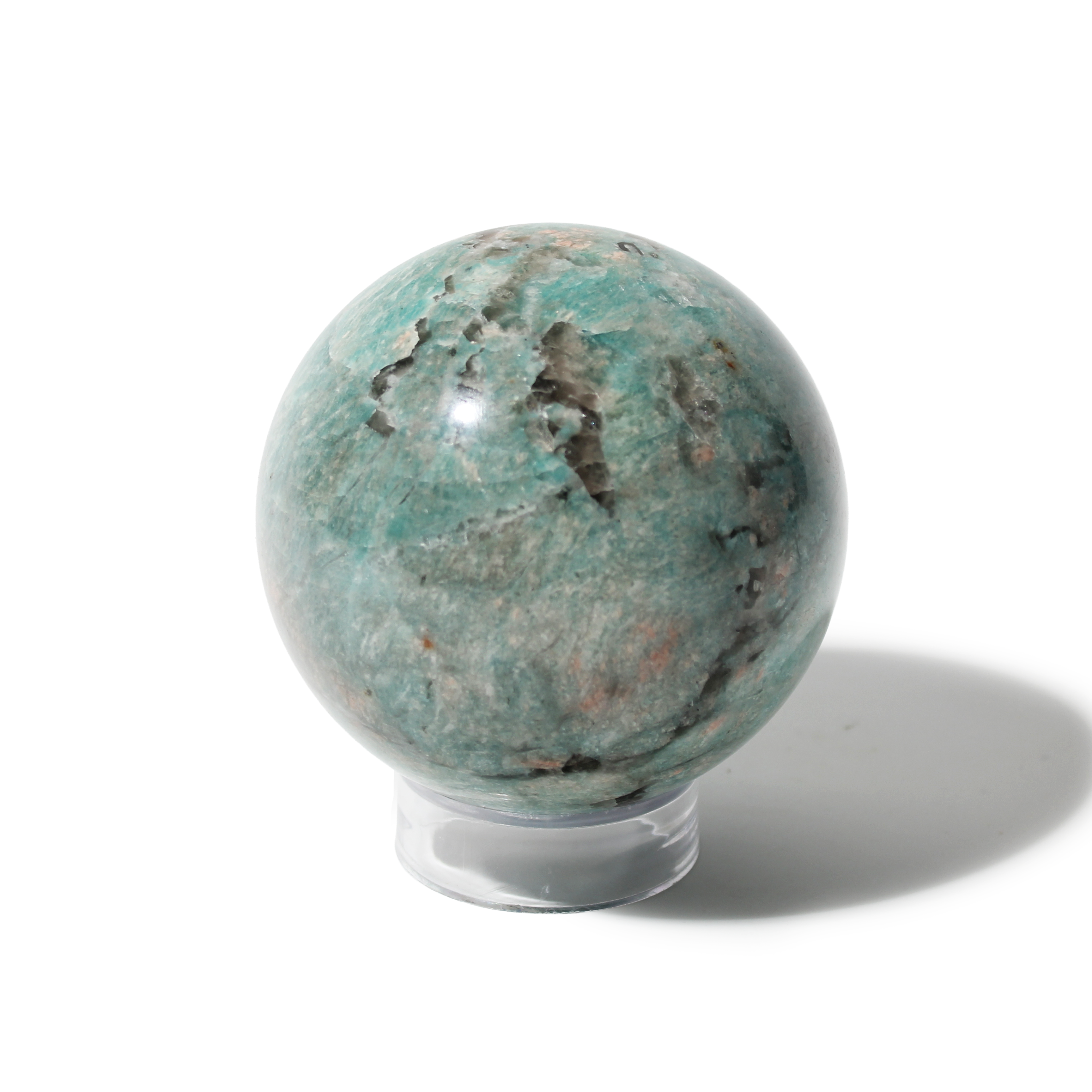 This Amazonite Sphere features soft blue-green tones with natural marbling, polished into a smooth spherical shape that creates a calming, balanced presence.