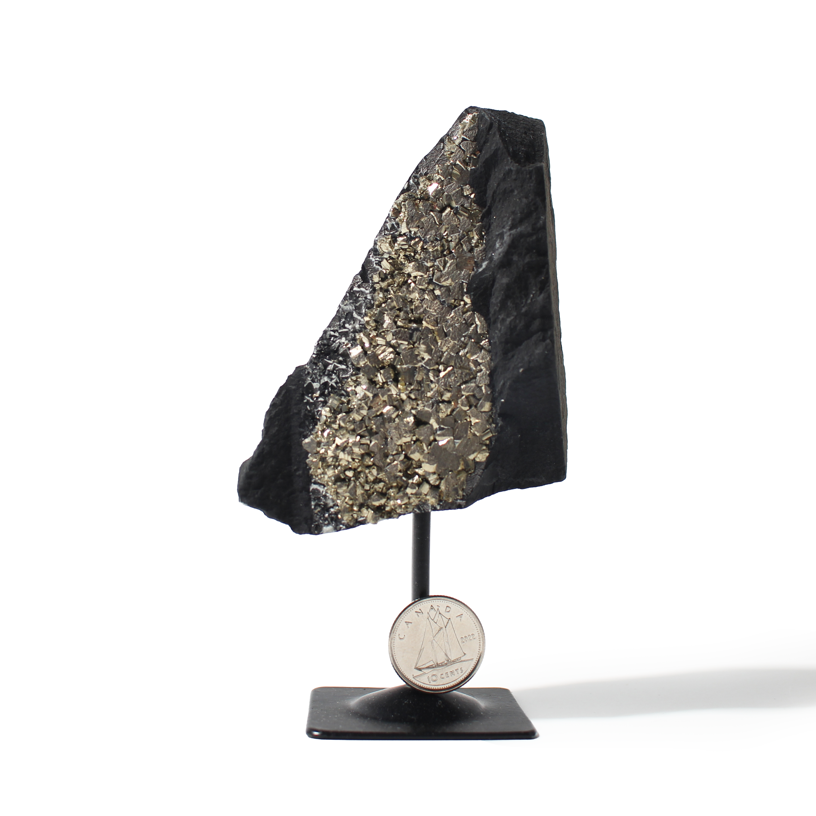 Un amas de cristaux de pyrite à la ténacité cassante sur un basalte noir [morceau]https://stonebridgeimports.ca/c/174-rock-mineral-chunk-in-bulk/) est une pièce de décoration unique qui égaye n'importe quel environnement, maison ou espace de travail et constitue une excellente idée de cadeau. Avec ce cadeau, l'Univers accorde une abondance de conscience de soi, de perspicacité et d'apprentissage. Les minéraux de pyrite présentent un lustre métallique, une brillance dorée/laitonnée et des propriétés réfléchissantes.
