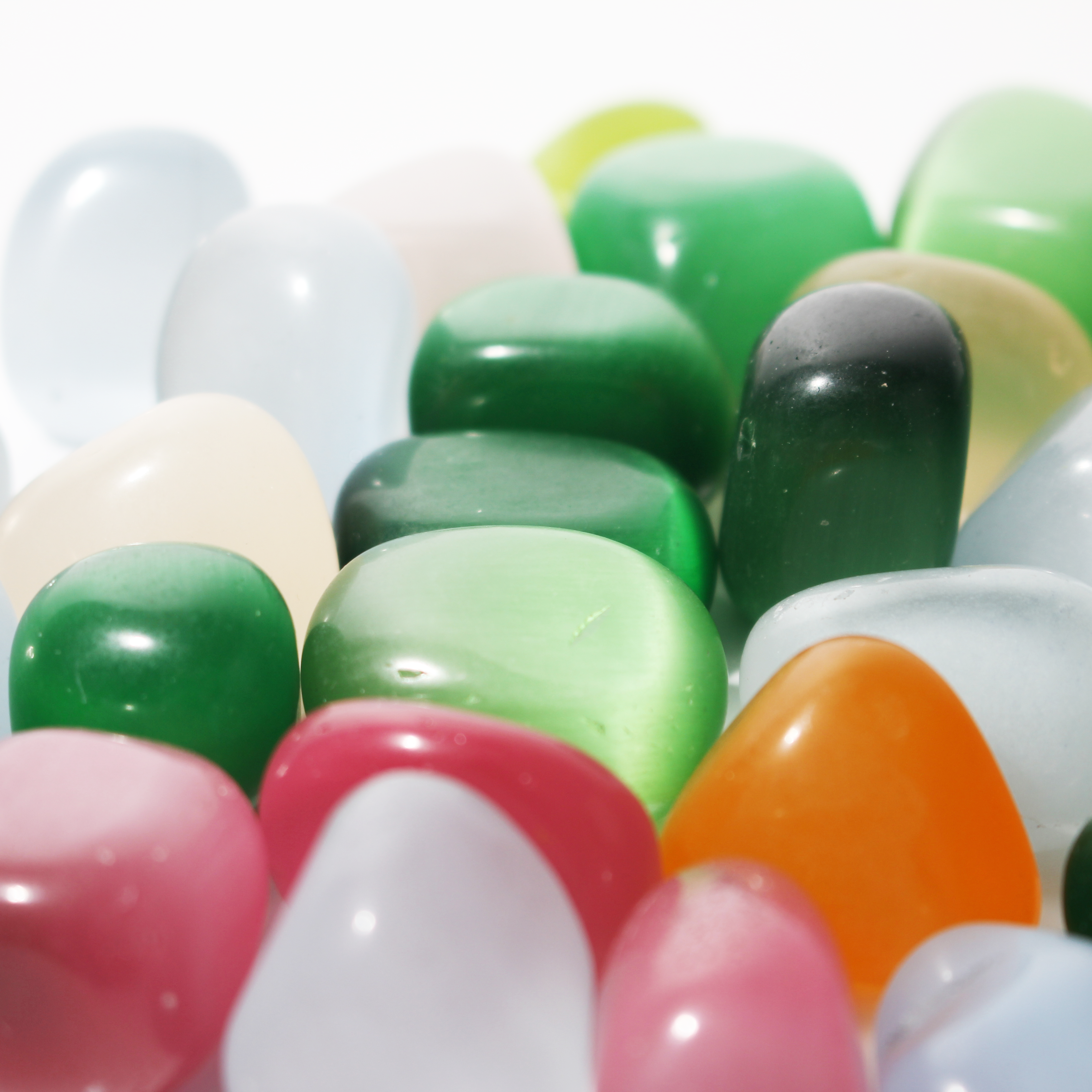 These Cat’s Eye Tumbled Stones feature a mesmerizing chatoyancy that catches the light with every movement, polished to a glassy, vibrant finish.