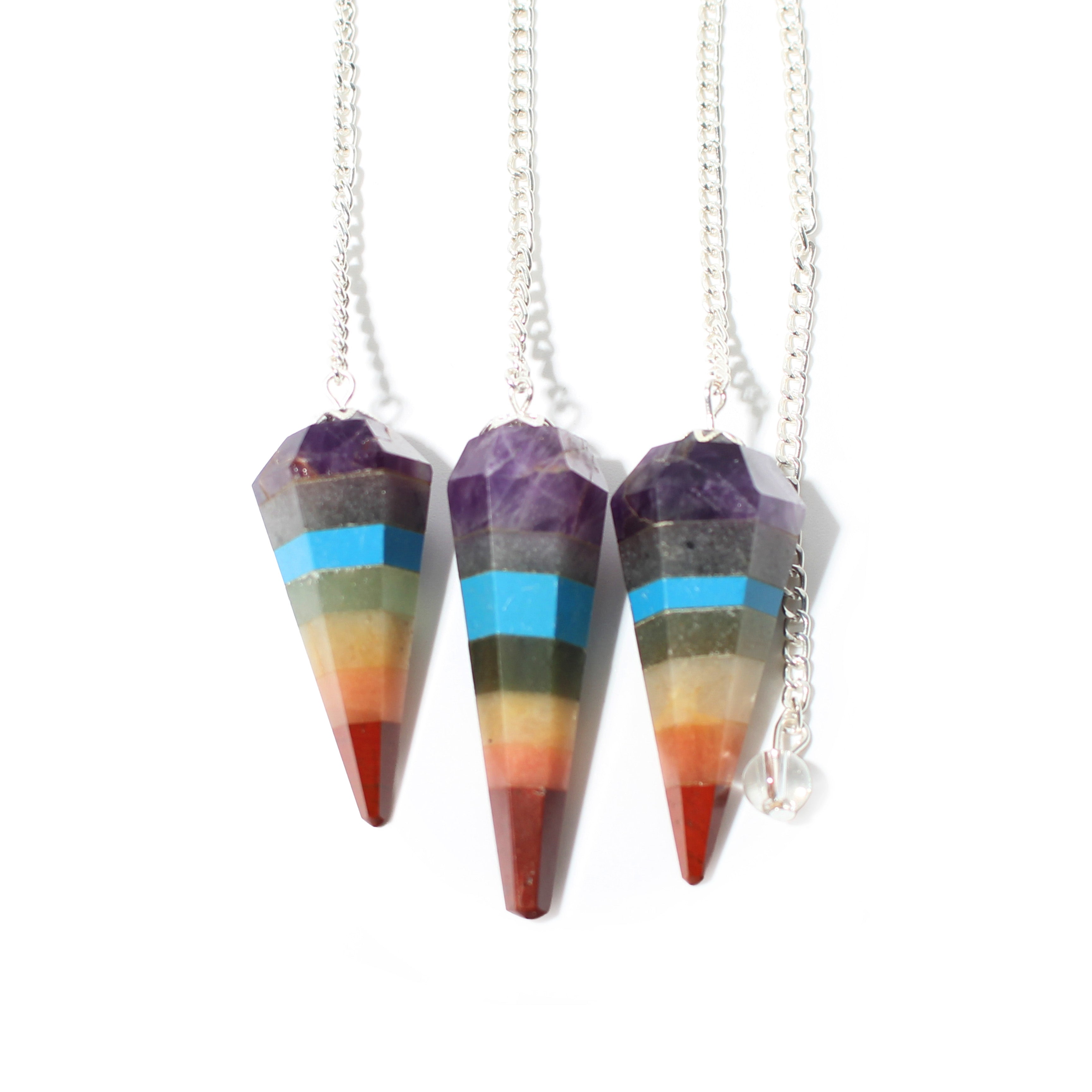 This 3-pack of Chakra Pendulums features six-faceted points made from stacked chakra stones, each topped with a coordinating bead. Vibrant and aligned, they're ideal for chakra balancing, energy readings, and intuitive work.