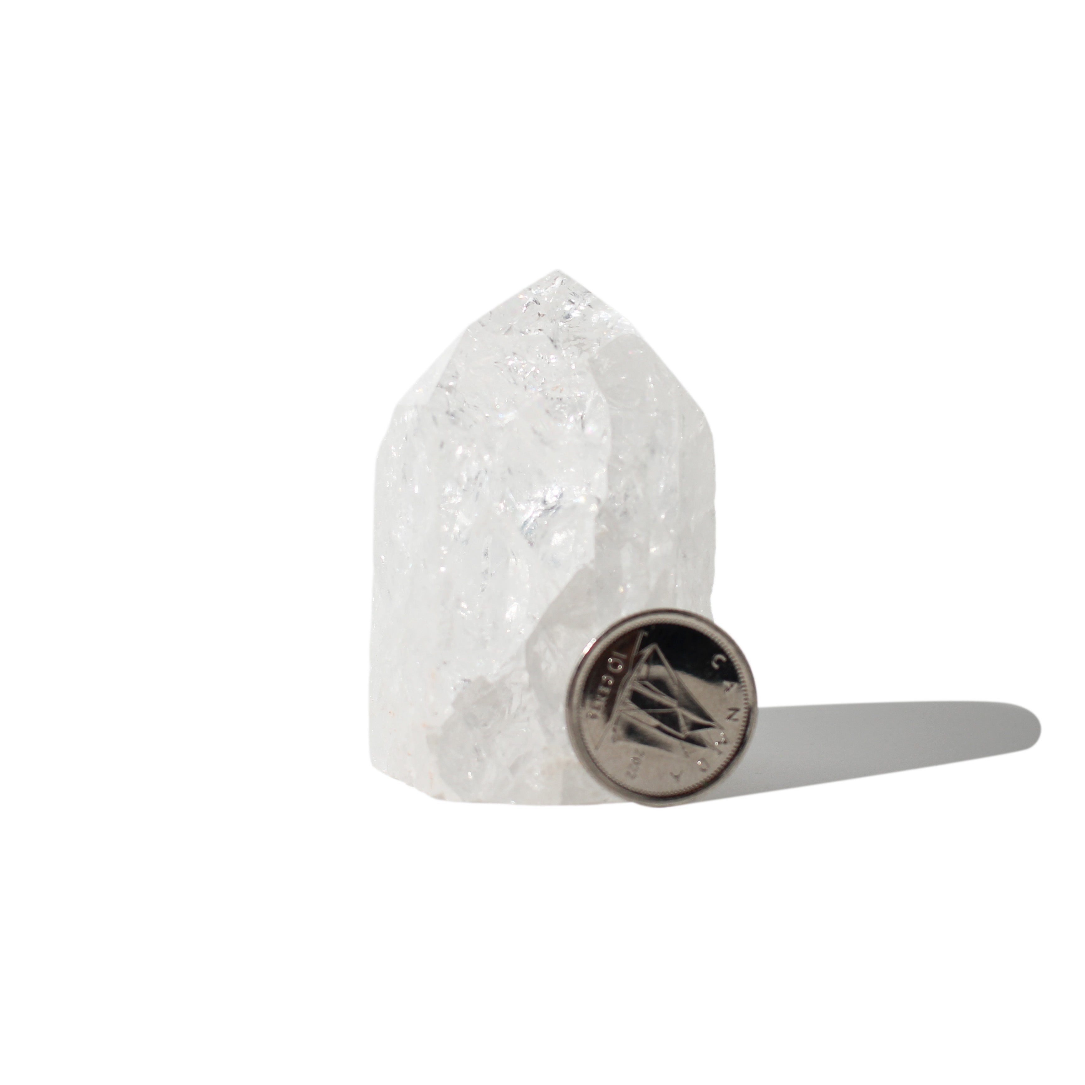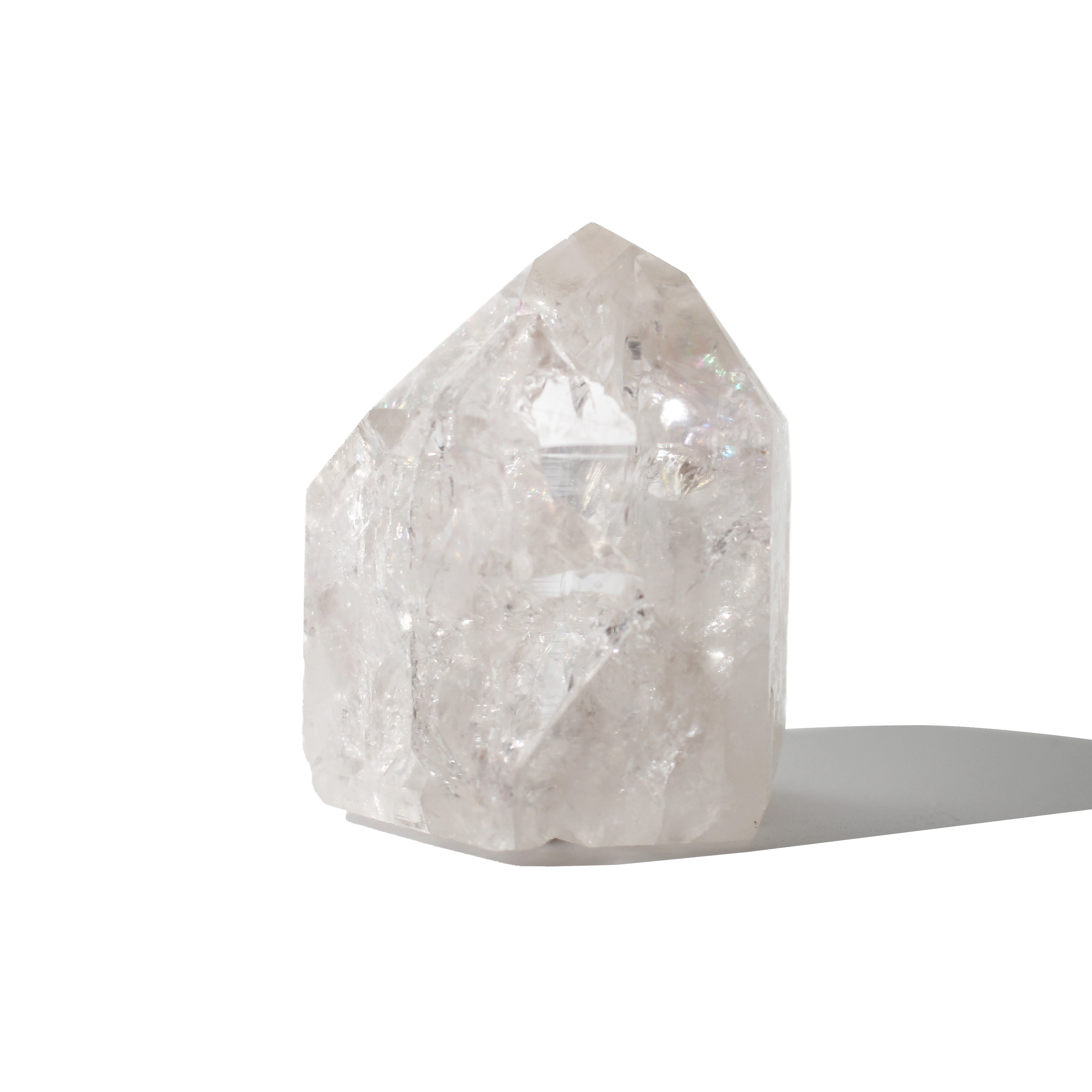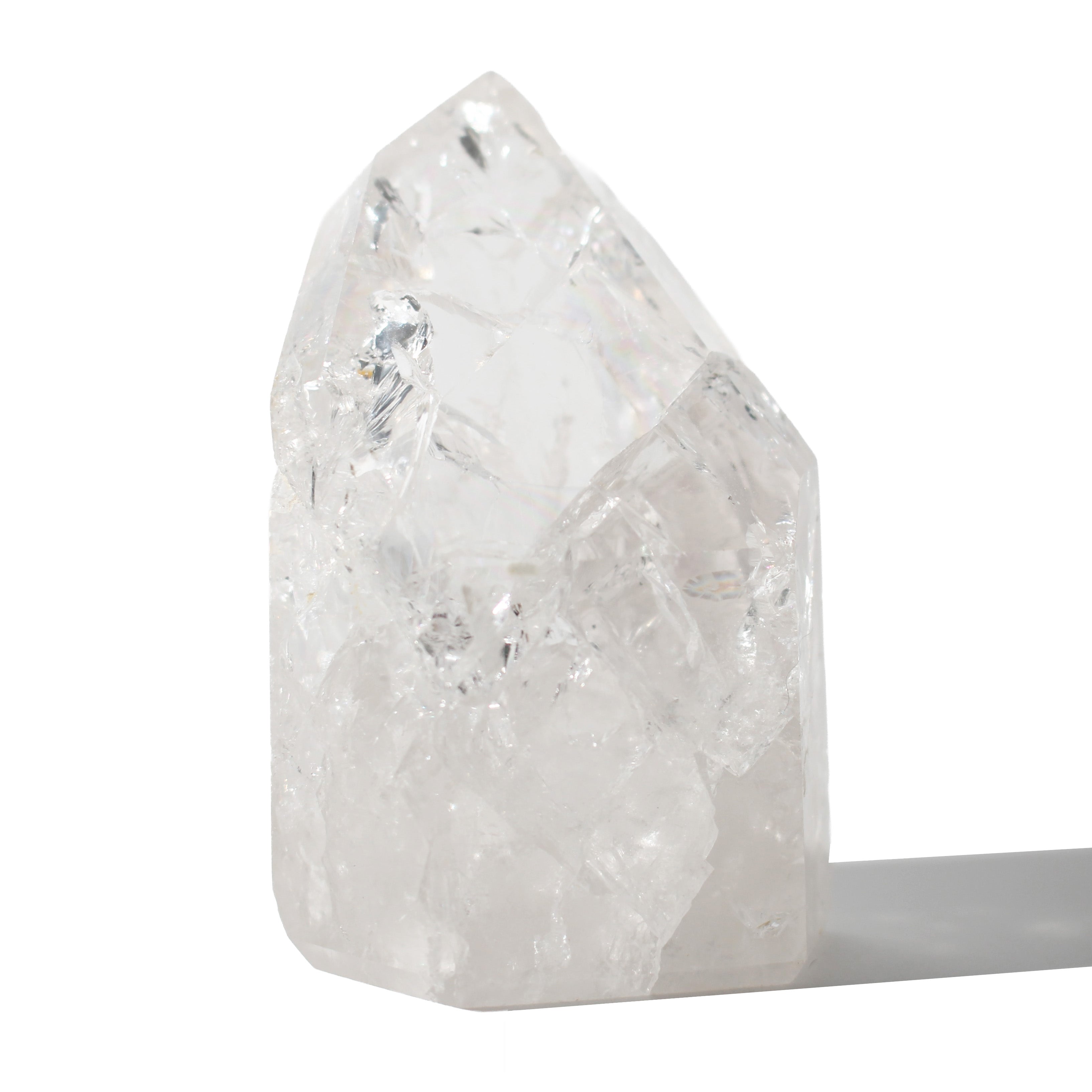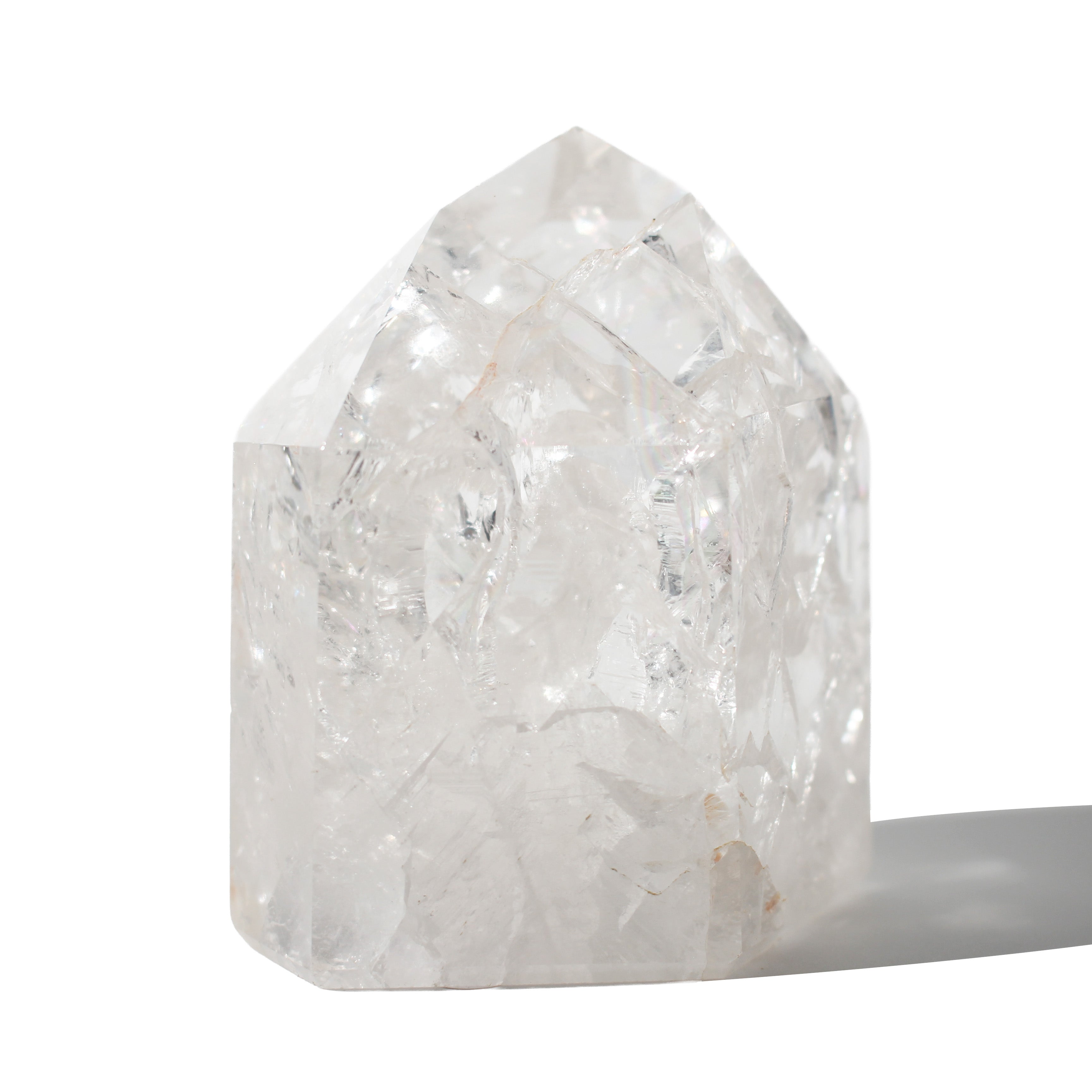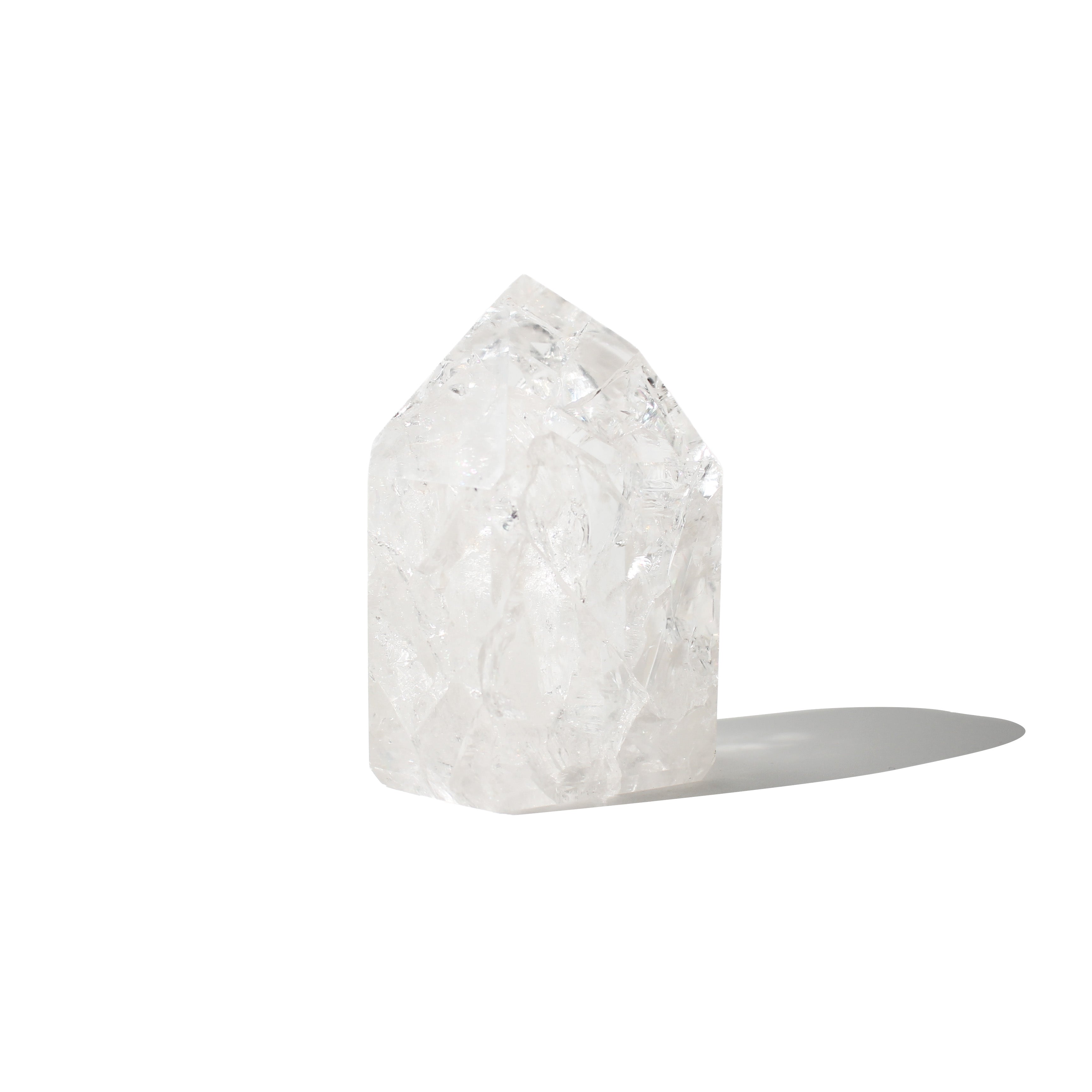 This Crackle Quartz Generator features clear quartz infused with natural fractures that create stunning internal patterns and rainbow flashes, polished to a high-gloss point perfect for retail displays and energy work.