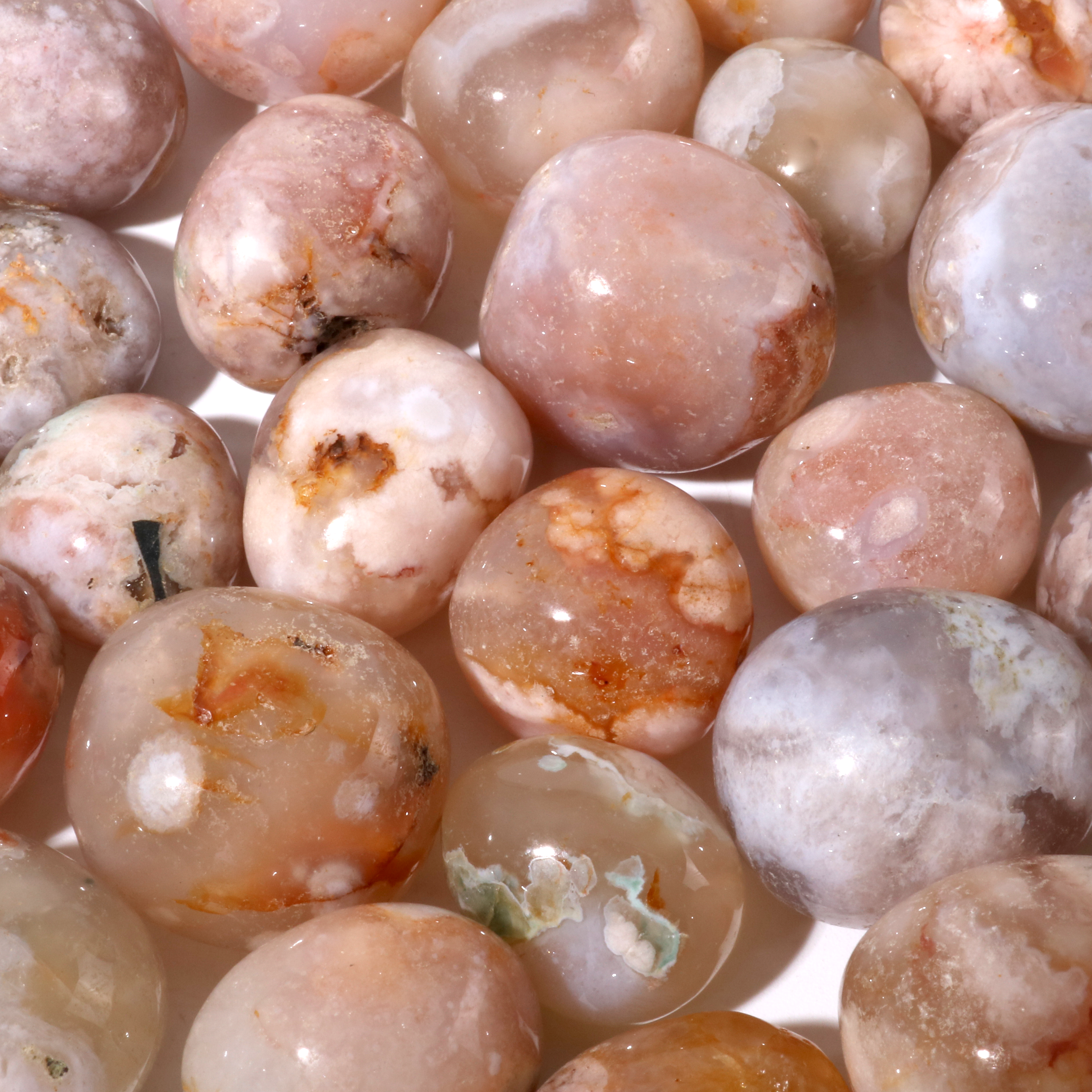 These Flower Agate Tumbled Stones are known for their soft pink tones with white, flower-like plume patterns that resemble blossoms in bloom. Each stone is gently polished to a smooth finish, highlighting its dreamy, cloud-like inclusions that make every piece one-of-a-kind.