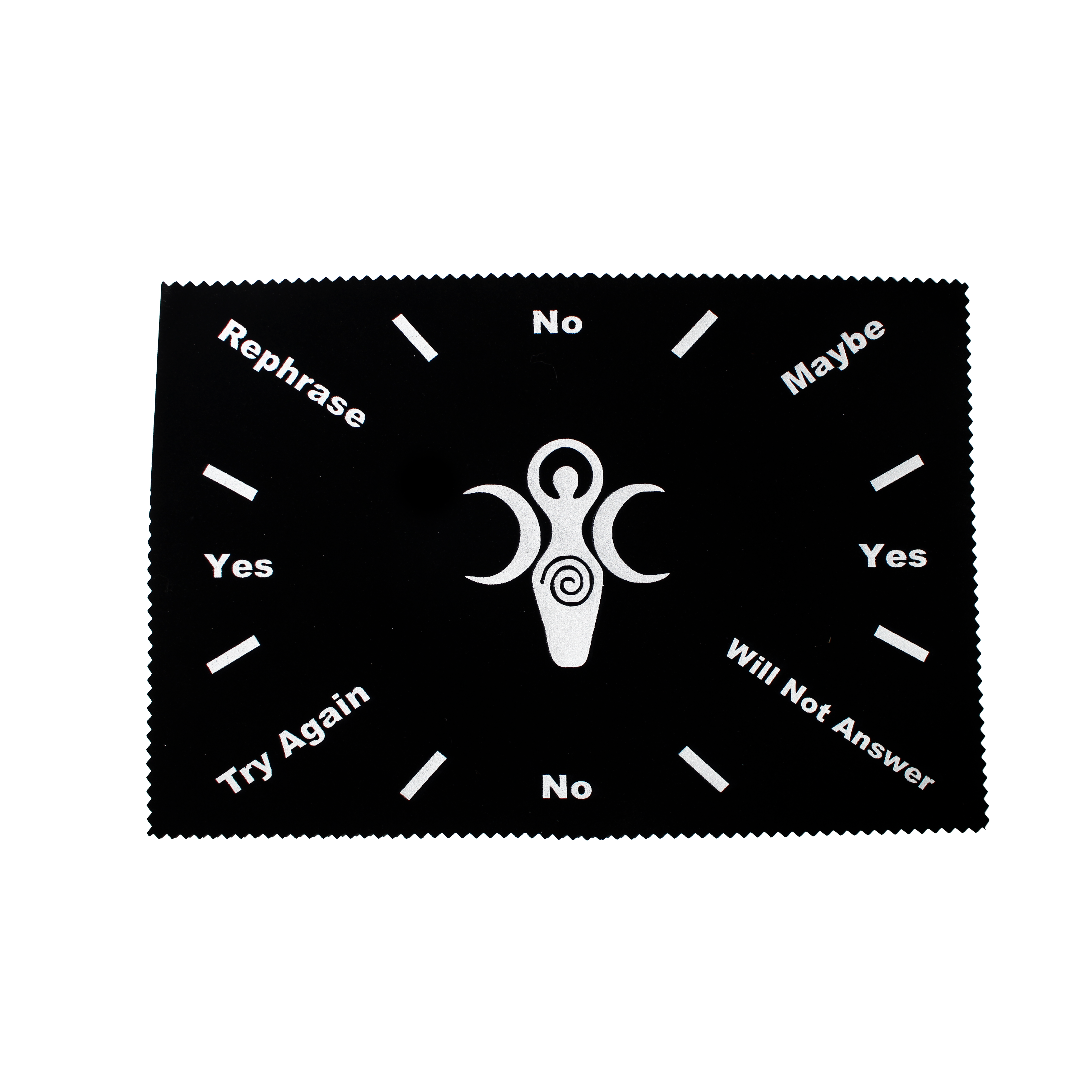 The Goddess Moon Pendulum Divination Mat features a mystical moon goddess design surrounded by intuitive prompts like “Yes,” “No,” “Maybe,” and “Rephrase.” Crafted to guide your pendulum sessions with clarity and flow.