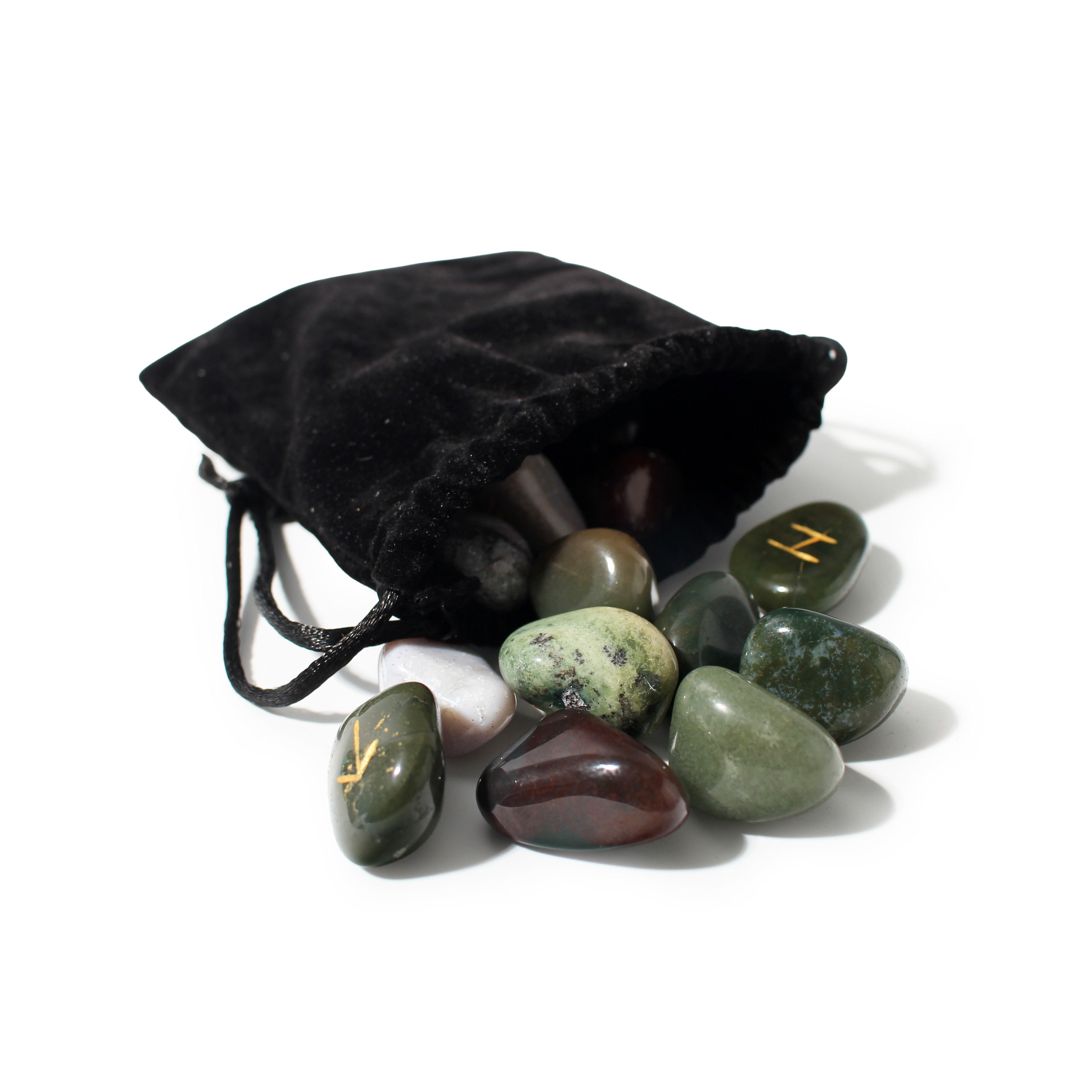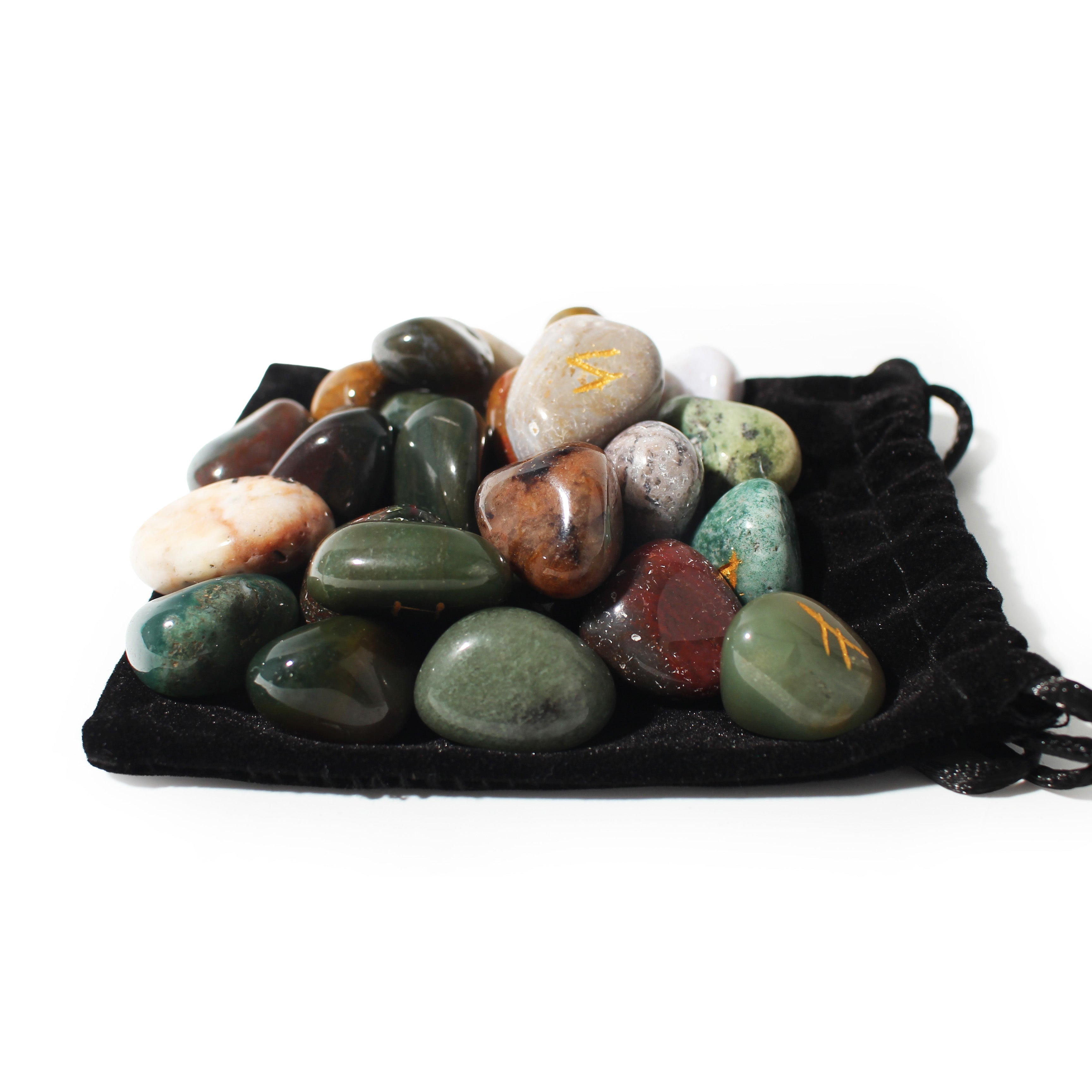 This India Agate Runes Set features hand-carved symbols on richly patterned stones in earthy greens, reds, and browns. Each rune carries a natural, grounding energy ideal for divination, meditation, and spiritual guidance.