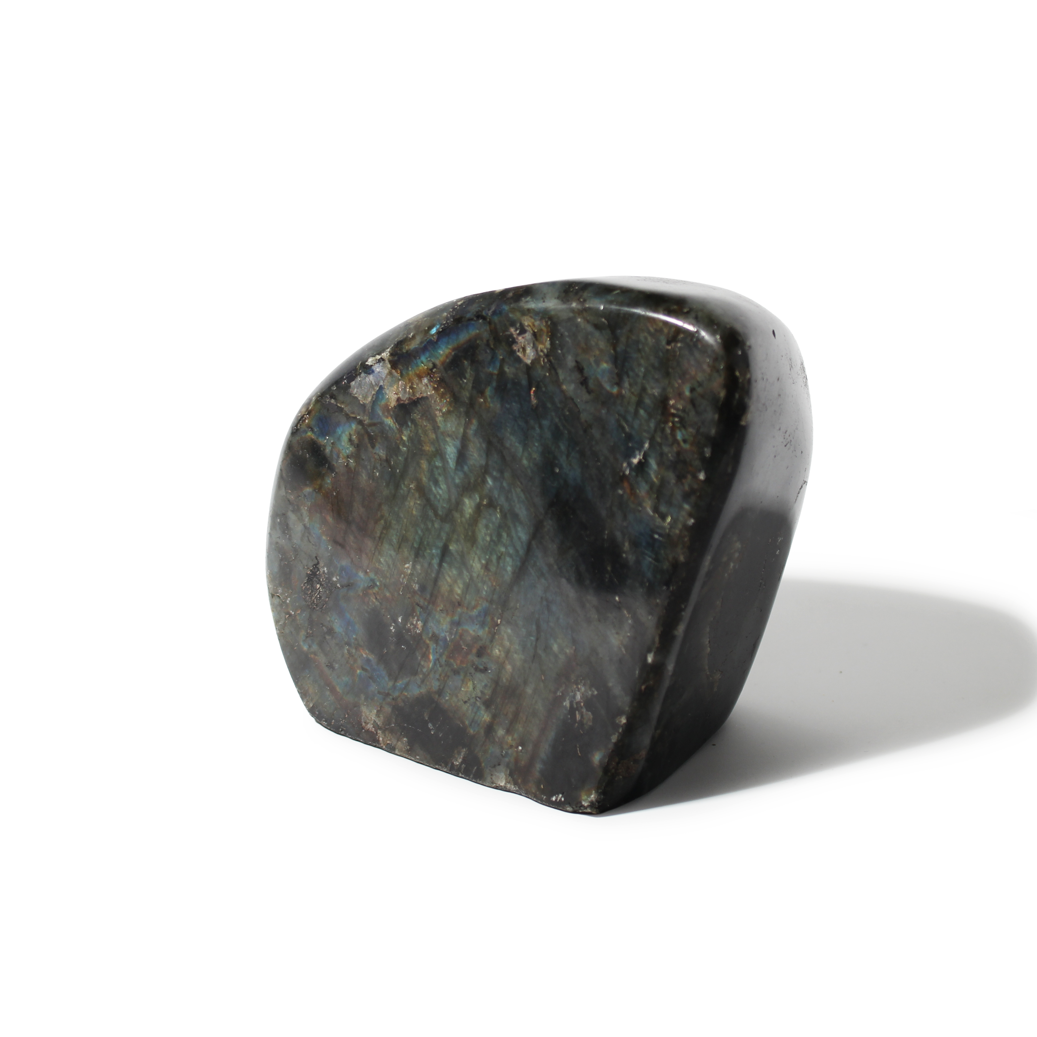 This Labradorite Freeform features smoky grey tones with flashes of blue and green, polished to a smooth surface that highlights its natural labradorescence and organic shape.