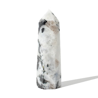 This Rainbow Moonstone Generator showcases milky white tones with stunning flashes of blue, cream, and occasional black inclusions, polished into an elegant point that attracts attention in any wholesale crystal display.