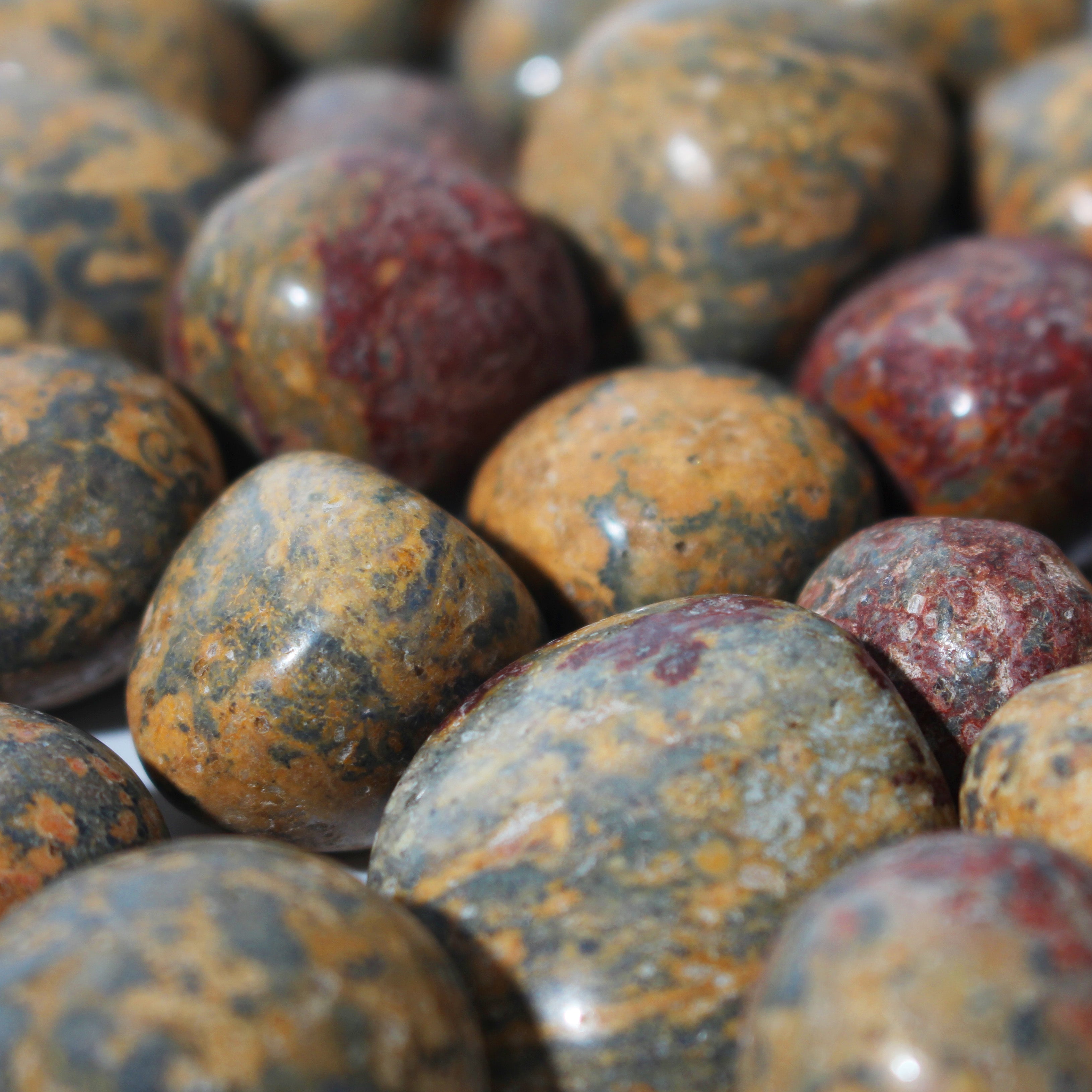 These Red Leopardskin Jasper Tumbled Stones showcase bold patterns in deep reds, warm browns, and sandy creams, each polished smooth with a wild, earthy beauty. Every stone feels primal, grounding, and protective.