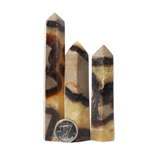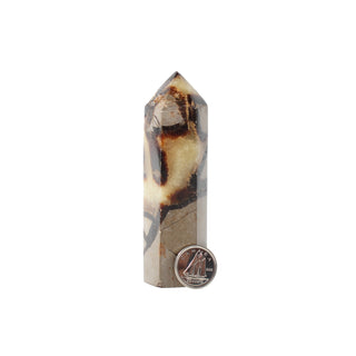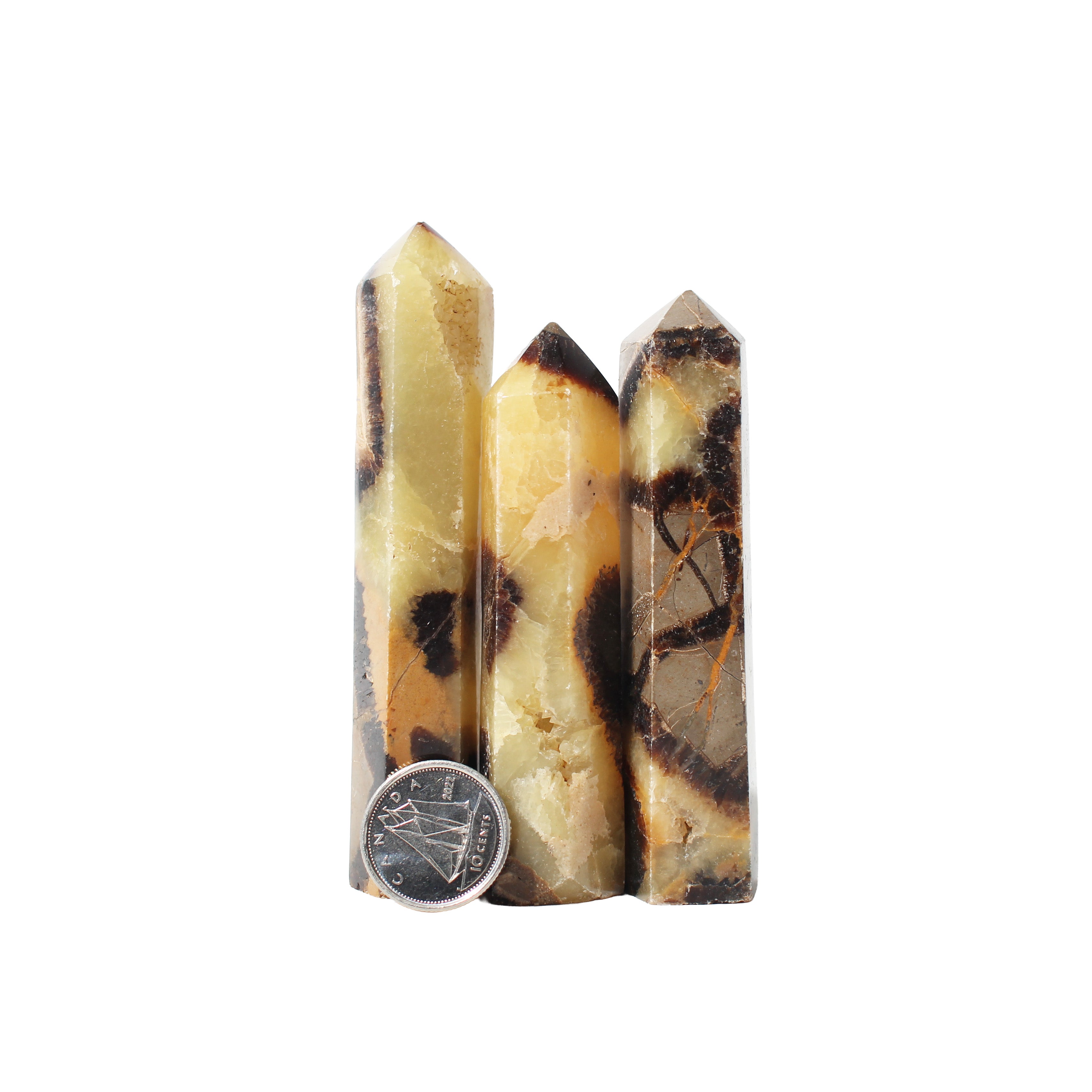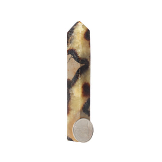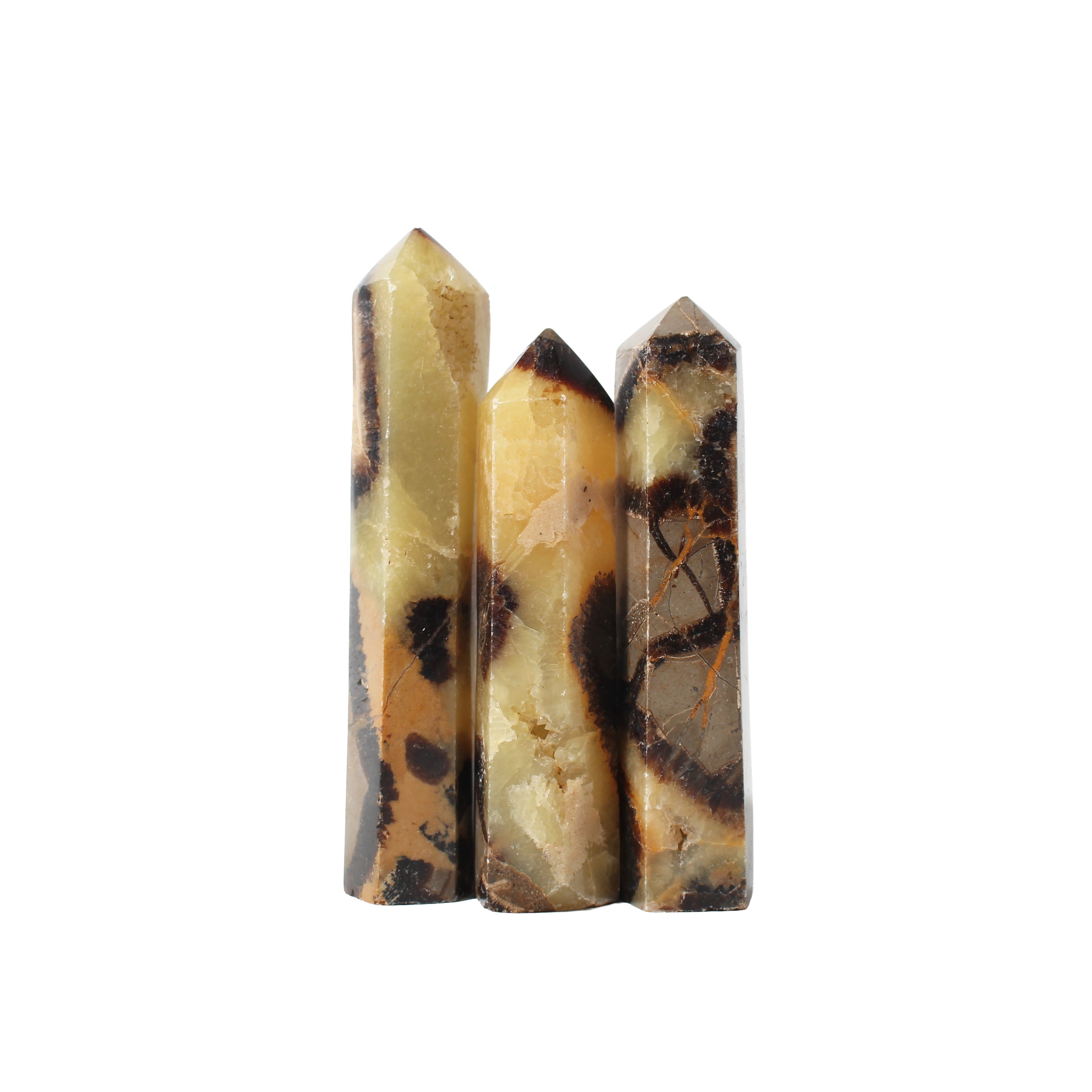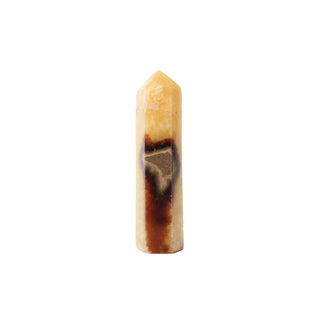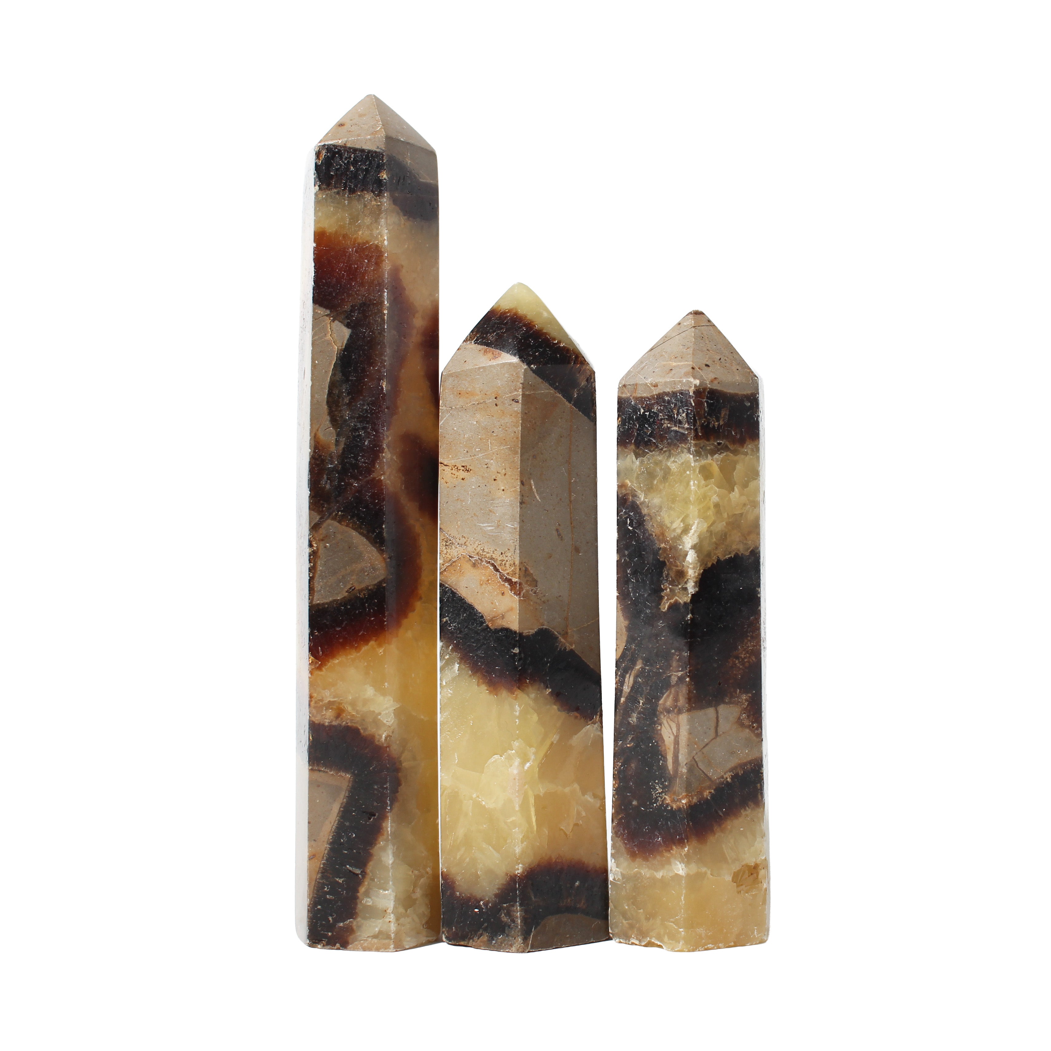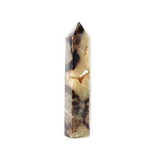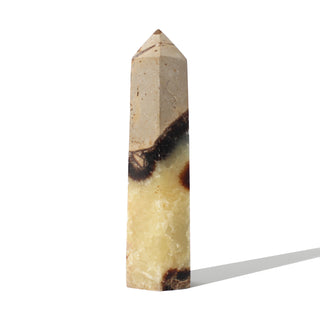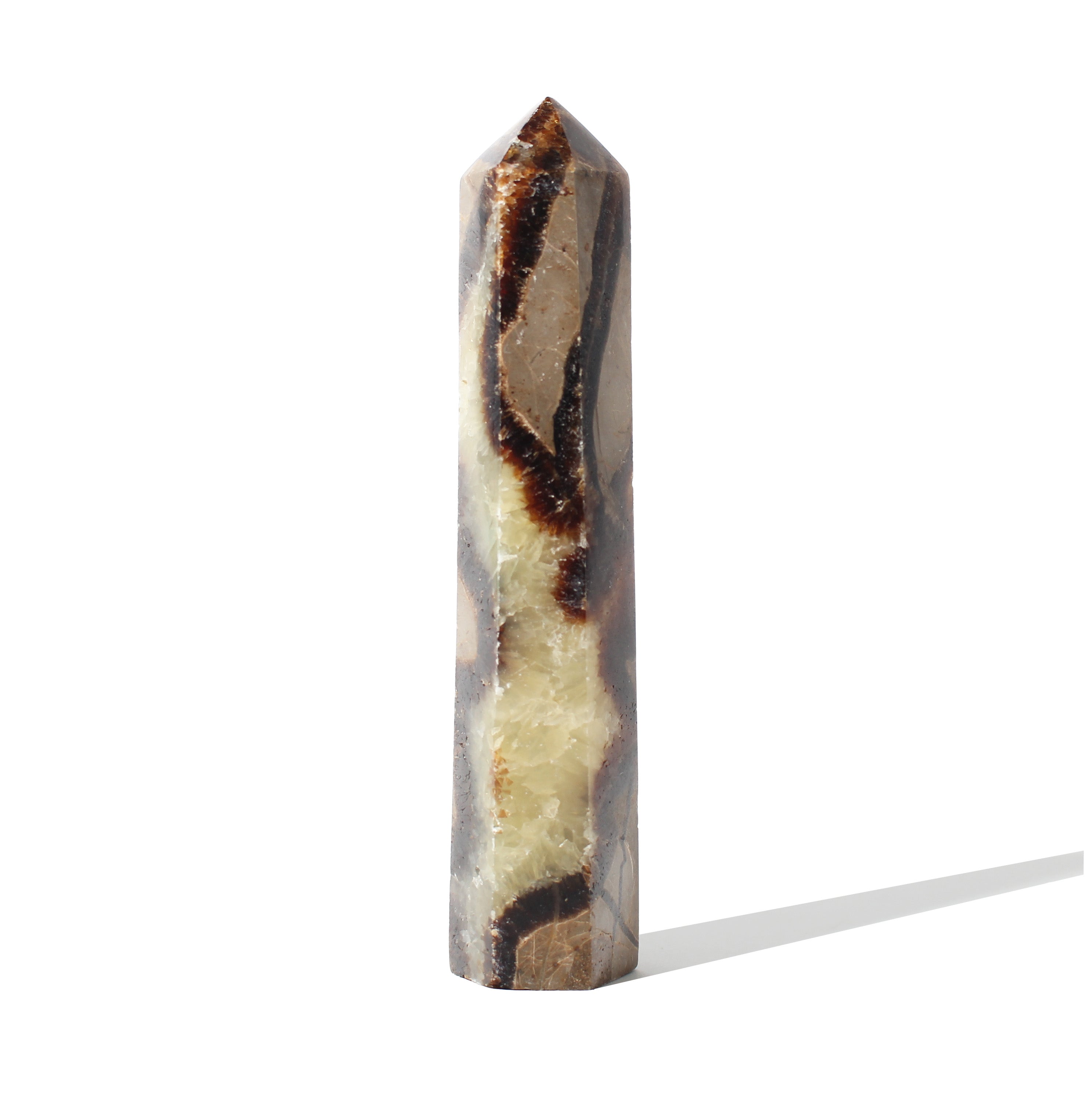 This Septarian Generator showcases stunning natural patterns of golden calcite, brown aragonite, and grey limestone, polished into a bold, eye-catching point that adds variety and uniqueness to your wholesale crystal inventory.