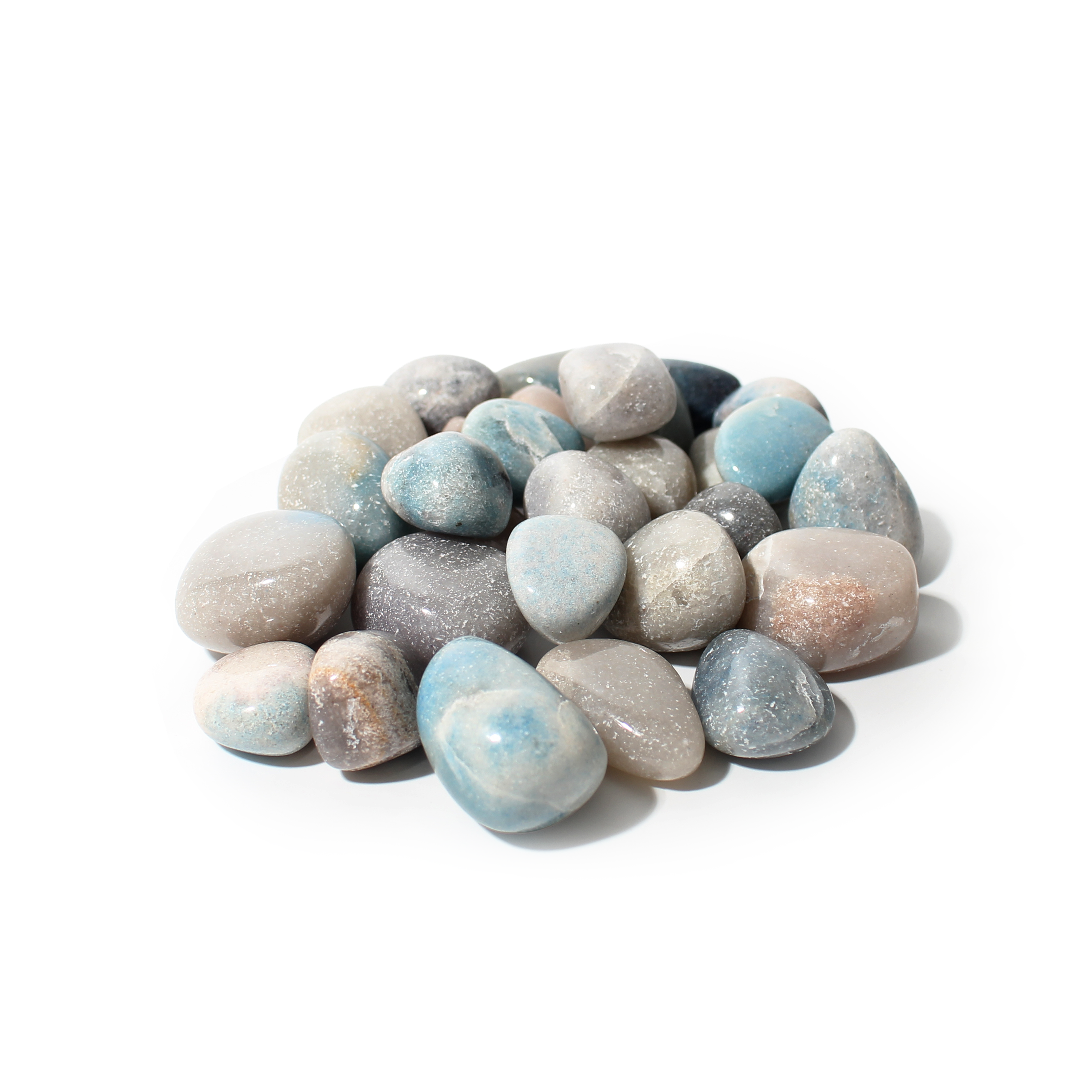 These Trolleite Tumbled Stones display soothing shades of blue with subtle white and grey patterns, polished to a smooth, calming finish perfect for carrying, meditation, or display.