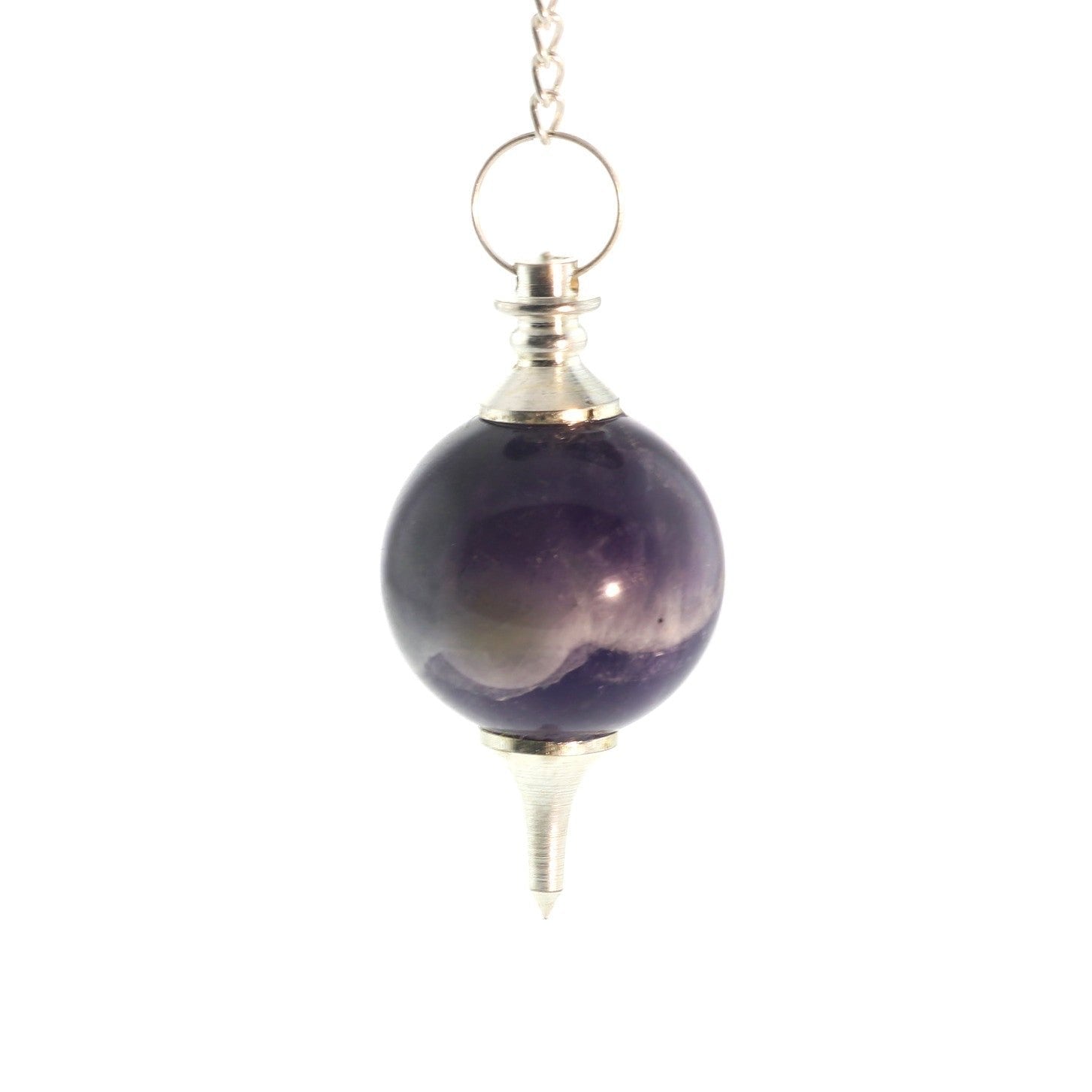 This pendulum is made of an amethyst stone that is carved and attached to a metal bail. The stone appears a wine-shaded purple, though it can and will be as pale as lavender, with some shades of a washed white tone.