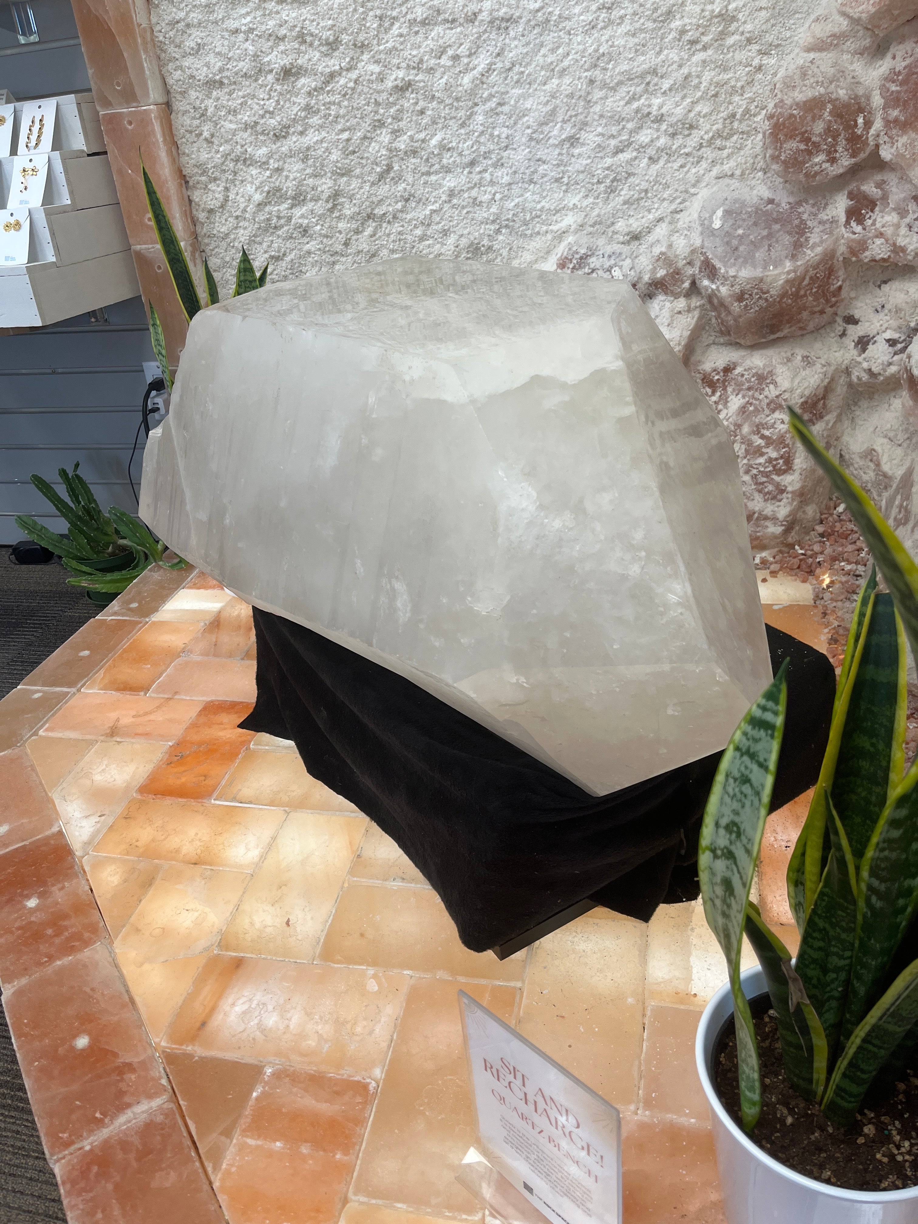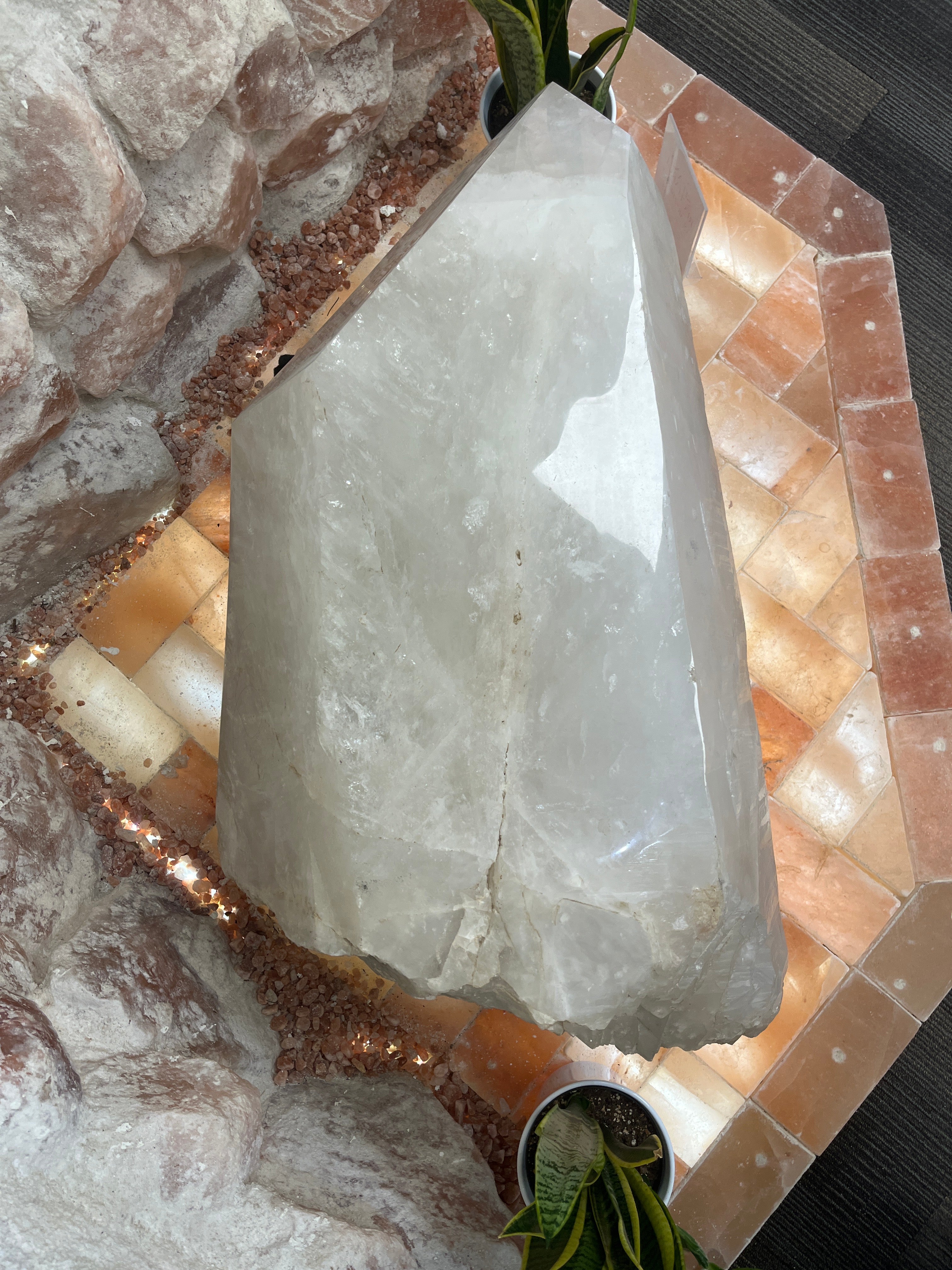 Clear quartz is renowned for the belief of its powerful cleansing and amplifying properties. This colossal clear quartz point, with its rough base, is believed to serve as a potent energy focal point, promoting clarity, purification, and spiritual growth within your surroundings.