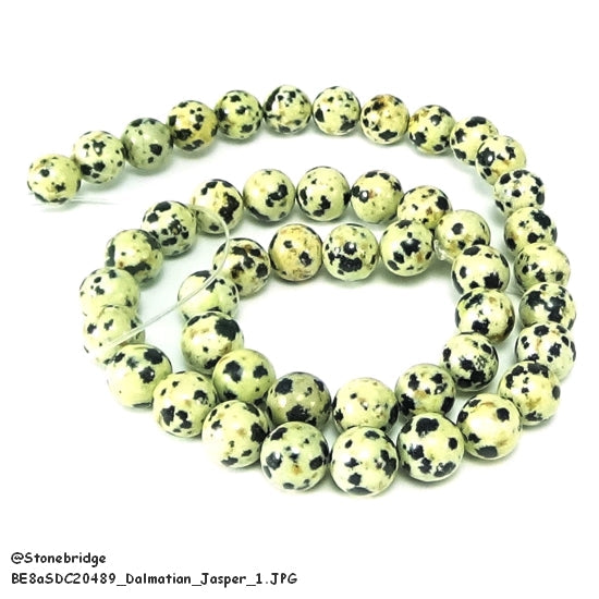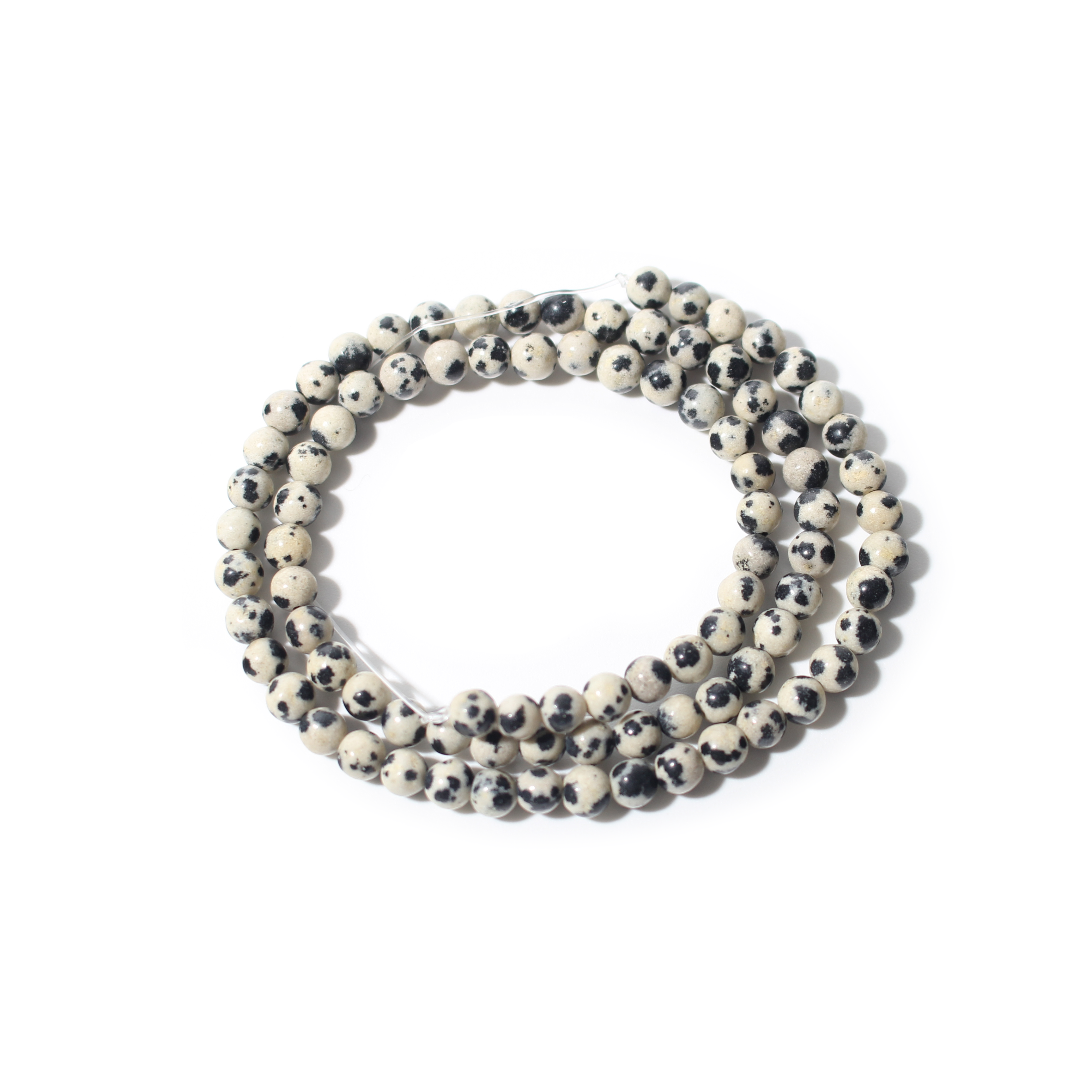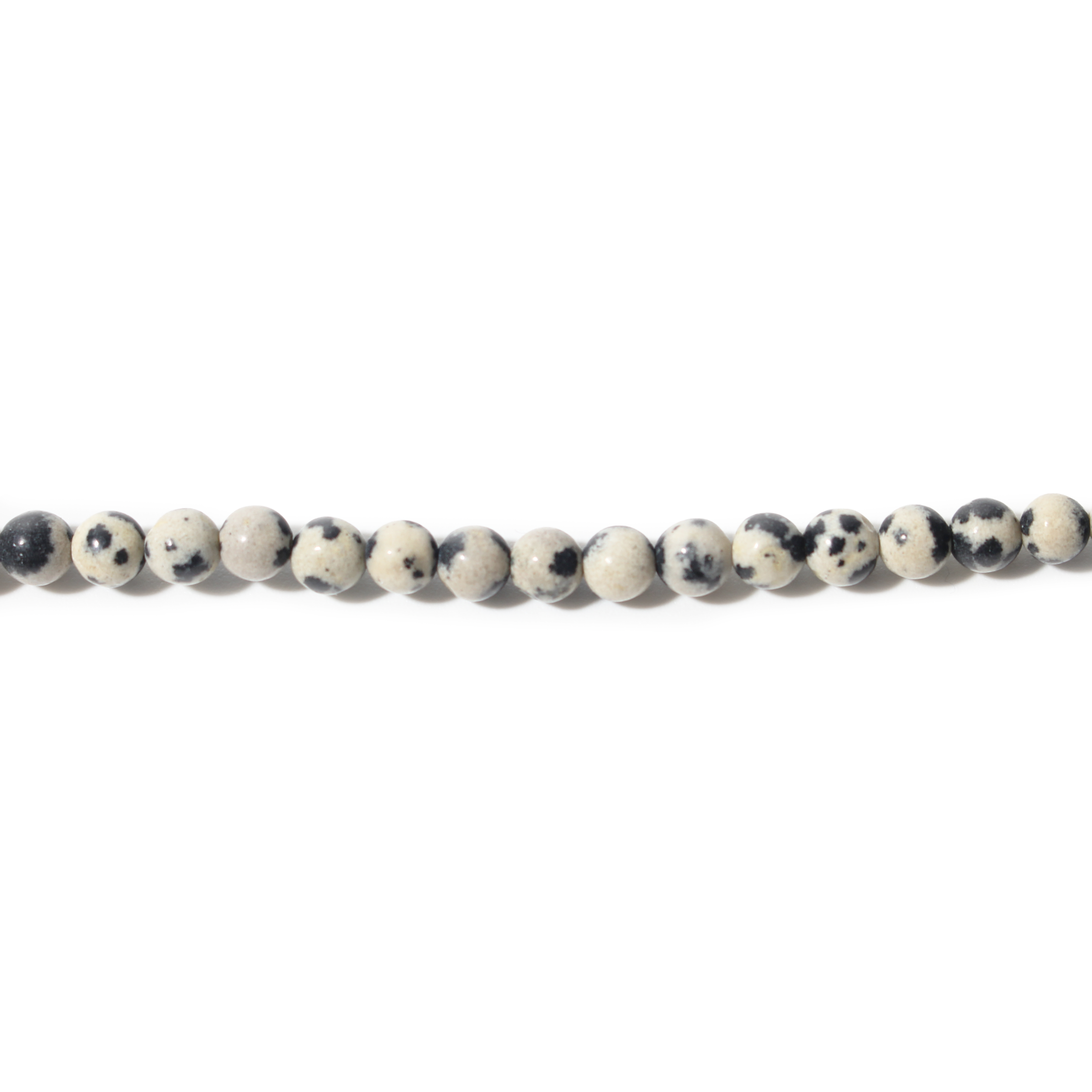 This Dalmatian Jasper Round Strand features beads in creamy beige tones with playful black and brown spots, perfect for adding a fun, earthy touch to your jewelry designs.
