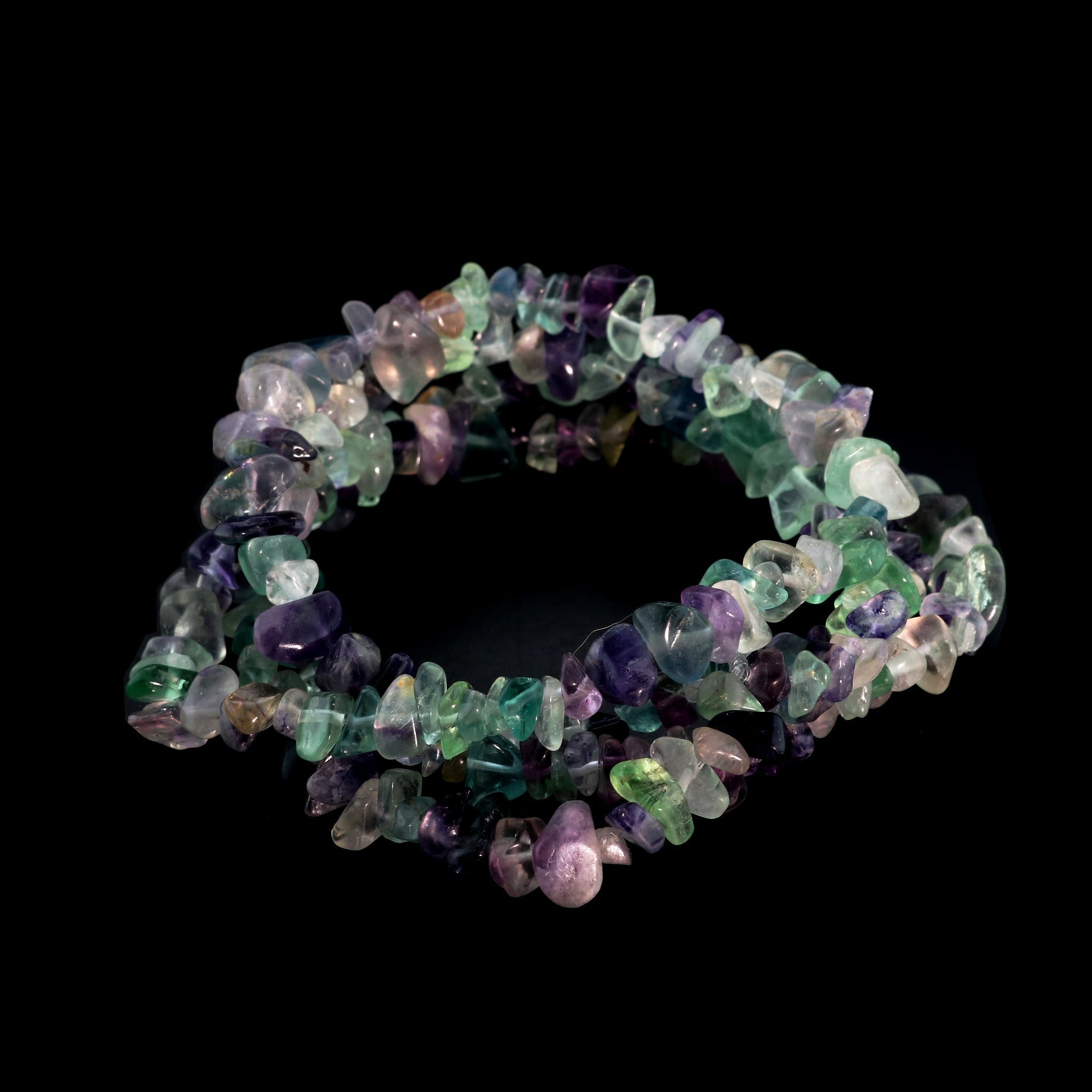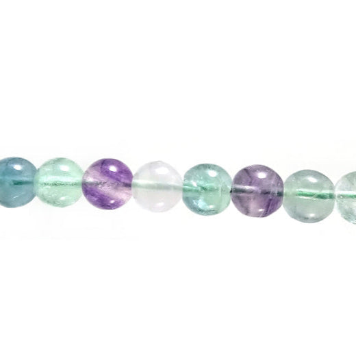 This Fluorite Round Strand displays a beautiful mix of purple, green, blue, and clear hues. The natural banding and vibrant tones make each strand visually unique.